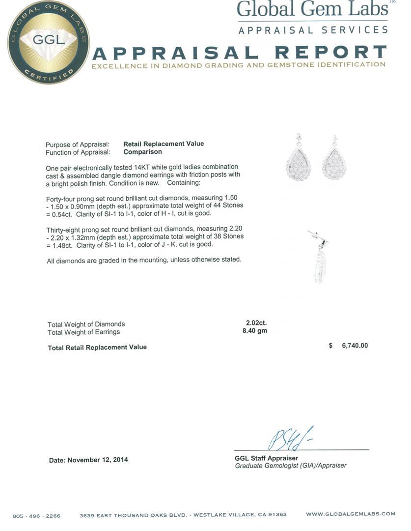 One pair electronically tested 14KT white gold ladies combination cast & assembled dangle diamond earrings with friction posts with a bright polish finish. Condition is new. Containing: Forty-Four prong set round brilliant cut diamonds, measuring 1.50 - 1.50 x 0.90mm (depth est.) approximate total weight of 44 Stones = 0.54ct. Clarity: SI-1 to I-1. Color: H - I, Cut is Good. Thirty-Eight prong set round brilliant cut diamonds, measuring 2.20 - 2.20 x 1.32mm (depth est.) approximate total weight of 38 Stones = 1.48ct. Clarity: SI-1 to I-1. Color: J - K, Cut is Good. All diamonds are graded in the mounting, unless otherwise stated. Total Weight of Diamonds 2.02ct. Total Weight of Earrings 8.40 grams. GGL Appraised.