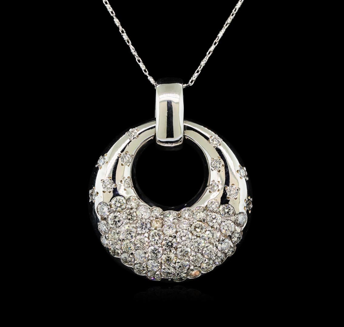 One electronically tested 14KT white gold ladies cast diamond pendant & chain 18.0" long, with a lobster claw clasp with a bright polish finish. Identified with markings of "14K". Condition is new. Containing: Seventy prong set round brilliant cut diamonds, measuring 2.70 - 1.30 x 1.20mm (depth est.) approximate total weight of 70 Stones = 2.04ct. Clarity: SI-1 to SI-2. Color: J - K. All diamonds are graded in the mounting, unless otherwise stated. Total Weight of Diamonds 2.04ct. Total Weight of Pendant & Chain 14.00 grams. GGL Appraised.