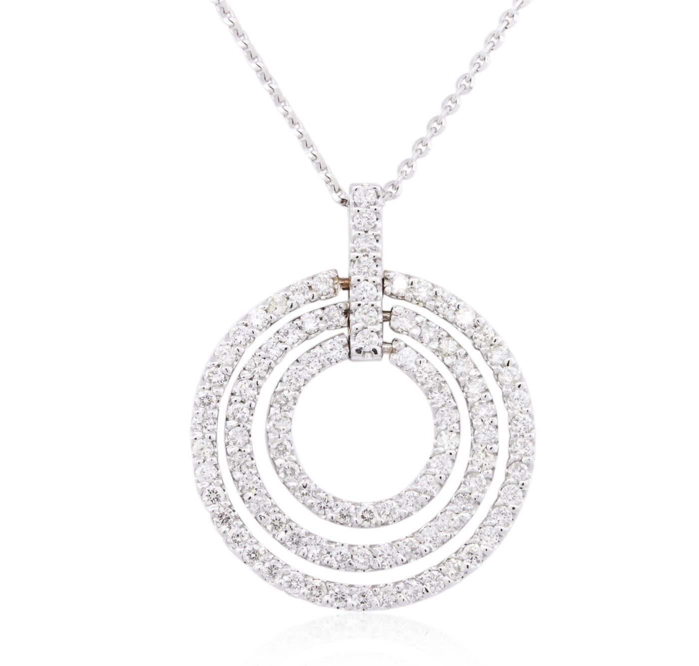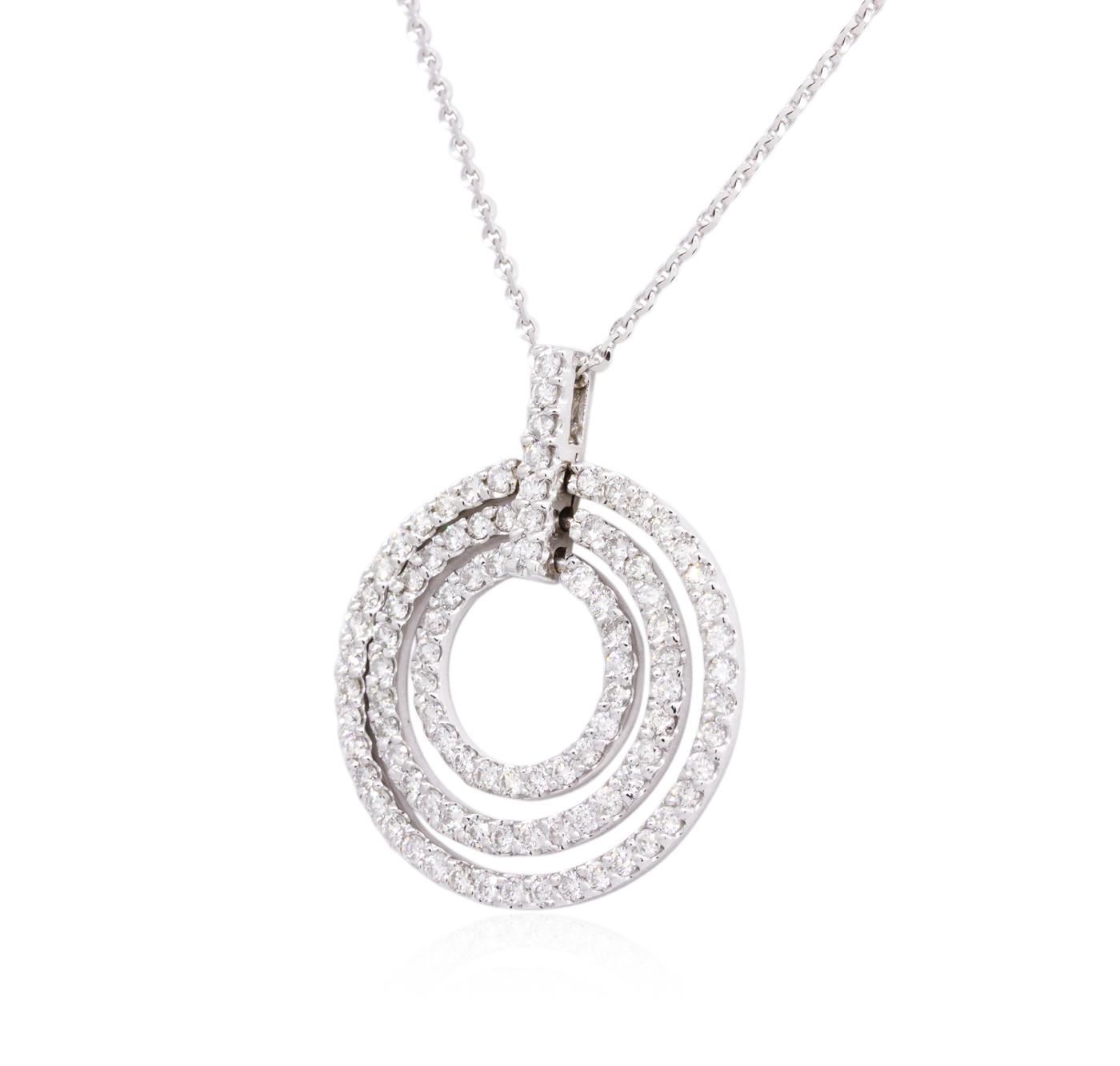 One electronically tested 14KT white gold ladies combination cast & assembled diamond pendant & chain 18.0" long, cable link with a lobster claw clasp with a bright polish finish. Identified with markings of "14K". Condition is new. Containing: Ninety-Six prong set round brilliant cut diamonds, measuring 1.80 - 1.80 x 1.08mm (depth est.) approximate total weight of 96 Stones = 2.05ct. Clarity: SI-2 to I-1. Color: J - K, Cut is Good. All diamonds are graded in the mounting, unless otherwise stated. Total Weight of Diamonds 2.05ct. Total Weight of Pendant & Chain 9.50 grams. GGL Appraised at $7,120.00.