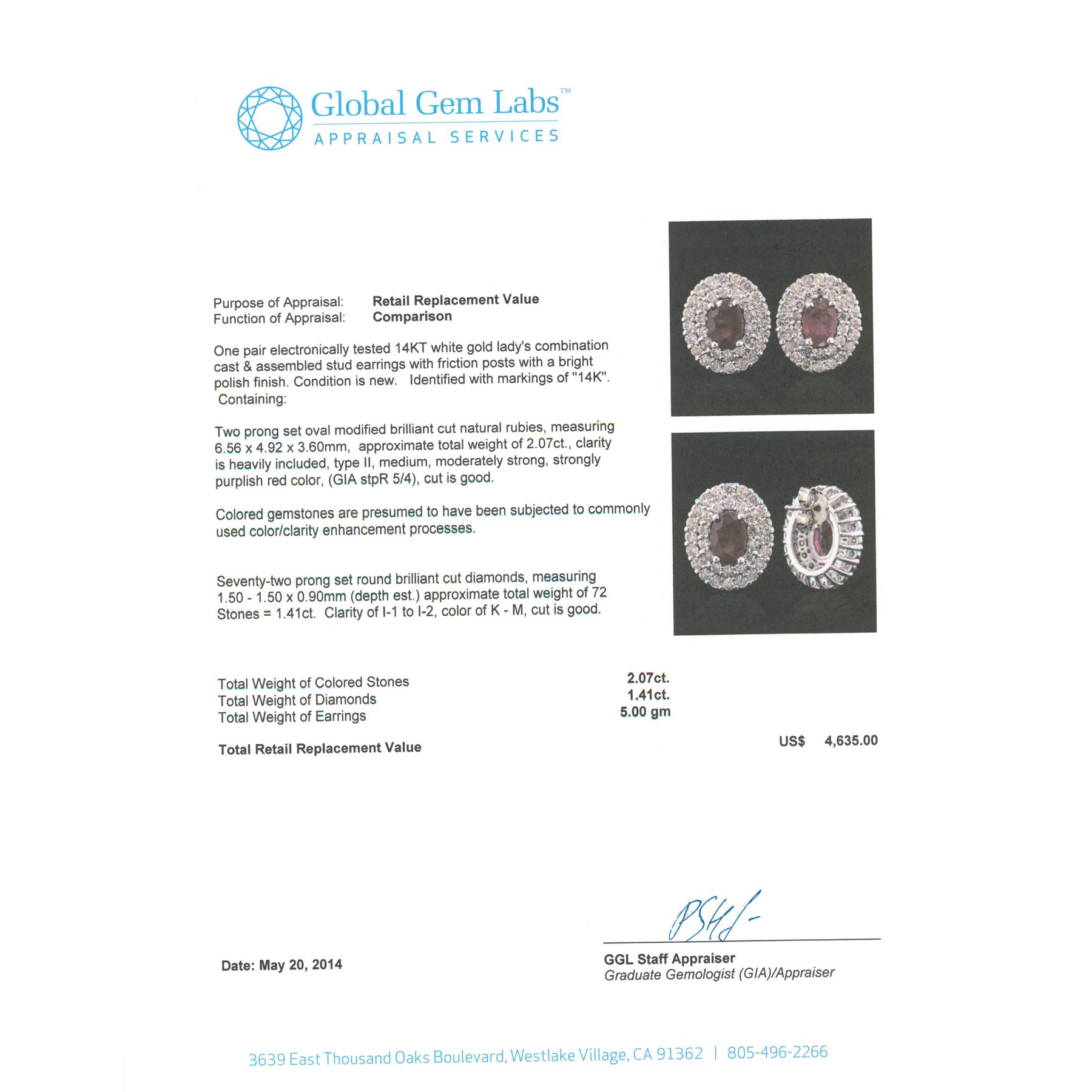 One pair electronically tested 14KT white gold Ladies combination cast & assembled stud earrings with friction posts with a bright polish finish. Condition is new. Identified with markings of "14K". Containing: Two prong set oval modified brilliant cut natural rubies, measuring 6.56 x 4.92 x 3.60mm, approximate. Total Weight of 2.07ct., clarity is heavily included, type II, medium, moderately strong, strongly purplish red color, (GIA stpR 5/4), cut is good. Colored gemstones are presumed to have been subjected to commonly used color/clarity enhancement processes. Seventy-Two prong set round brilliant cut diamonds, measuring 1.50 - 1.50 x 0.90mm (depth est.) approximate. Total Weight of 72 Stones = 1.41ct. Clarity: I-1 to I-2. Color: K - M, Cut is Good. Total Weight of Colored Stones 2.07ct. Total Weight of Diamonds 1.41ct. Total Weight of Earrings 5.00 grams. GGL Appraised at $4,635.00.