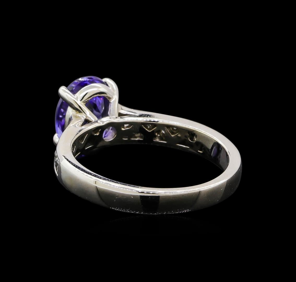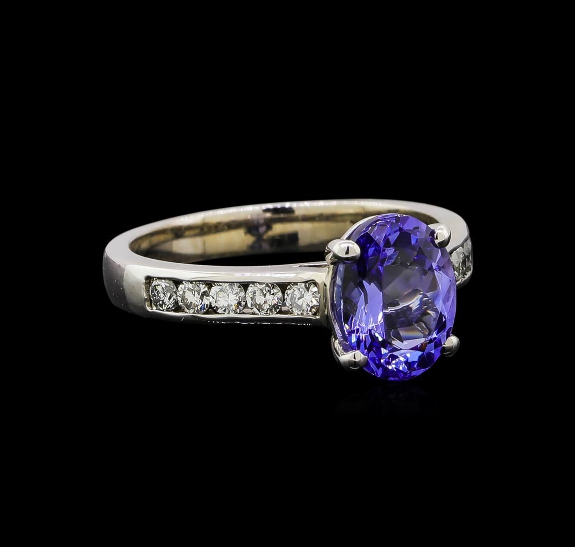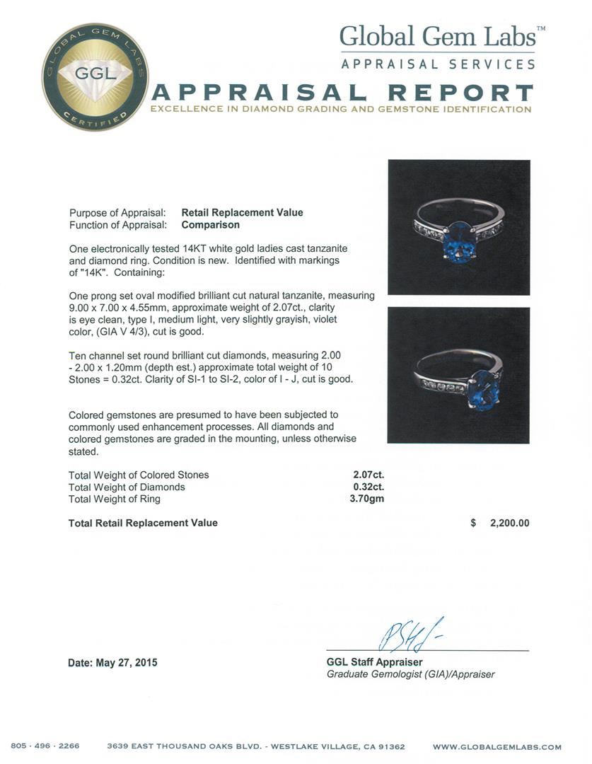 One electronically tested 14KT white gold ladies cast tanzanite and diamond ring. Identified with markings of "14K". Condition is new. Containing: One prong set oval modified brilliant cut natural tanzanite, measuring 9.00 x 7.00 x 4.55mm, approximate weight of 2.07ct., clarity is eye clean, type I, medium light, very slightly grayish, violet color, (GIA V 4/3), cut is good. Ten channel set round brilliant cut diamonds, measuring 2.00 - 2.00 x 1.20mm (depth est.) approximate total weight of 10 Stones = 0.32ct. Clarity: SI-1 to SI-2. Color: I - J, Cut is Good. Colored gemstones are presumed to have been subjected to commonly used enhancement processes. All diamonds and colored gemstones are graded in the mounting, unless otherwise stated. Total Weight of Colored Stones 2.07ct. Total Weight of Diamonds 0.32ct. Total Weight of Ring 3.70 grams. GGL Appraised.