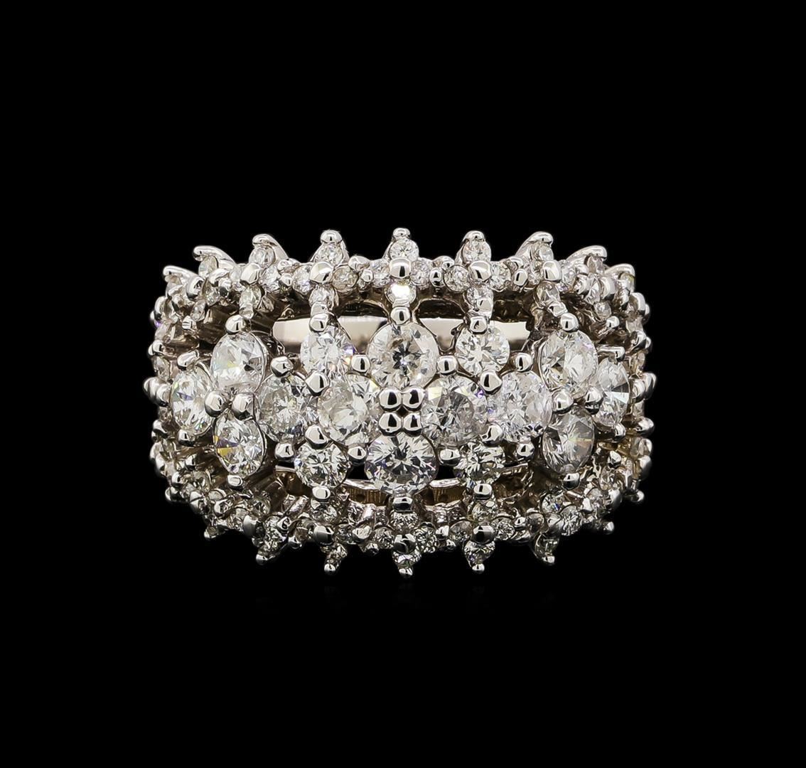 One electronically tested 14KT white gold ladies cast diamond ring with a bright polish finish. Identified with markings of "14K". Condition is new. Containing: Twelve prong set round brilliant cut diamonds, measuring 3.00 - 3.00 x 1.80mm (depth est.) approximate total weight of 12 Stones = 1.19ct. Clarity: I-1 to I-2. Color: I - J. Eighty-Four prong set round brilliant cut diamonds, measuring 2.50 - 1.30 x 1.14mm (depth est.) approximate total weight of 84 Stones = 0.90ct. Clarity: SI-2 to I-2. Color: I - J, Cut is Good. All diamonds are graded in the mounting, unless otherwise stated. Total Weight of Diamonds 2.09ct. Total Weight of Ring 10.00 grams. GGL Appraised.