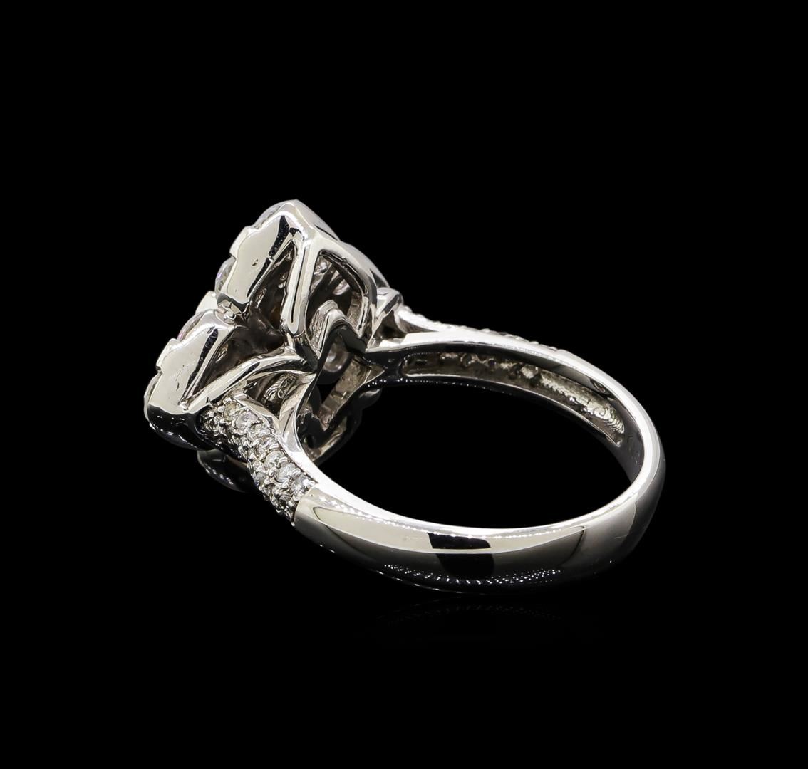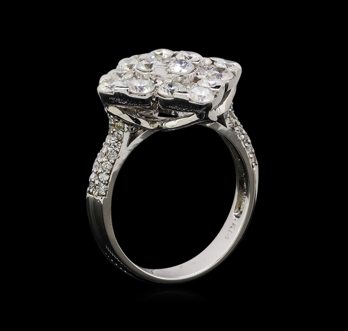 One electronically tested 14KT white gold ladies cast diamond ring. Identified with markings of "K14". Condition is new. Containing: Forty-Four prong set round brilliant cut diamonds, measuring 1.30 - 1.30 x 0.78mm (depth est.) approximate total weight of 44 Stones = 0.35ct. Clarity: I-1 to I-2. Color: I - J, Cut is Good. Twenty-One prong set round brilliant cut diamonds, measuring 3.00 - 2.00 x 1.50mm (depth est.) approximate total weight of 21 Stones = 1.79ct. Clarity: SI-2 to I-2. Color: I - J, Cut is Good. Diamonds are graded in the mounting, unless otherwise stated. Total Weight of Diamonds 2.14ct. Total Weight of Ring 6.80 grams. GGL Appraised at $5,065.00.