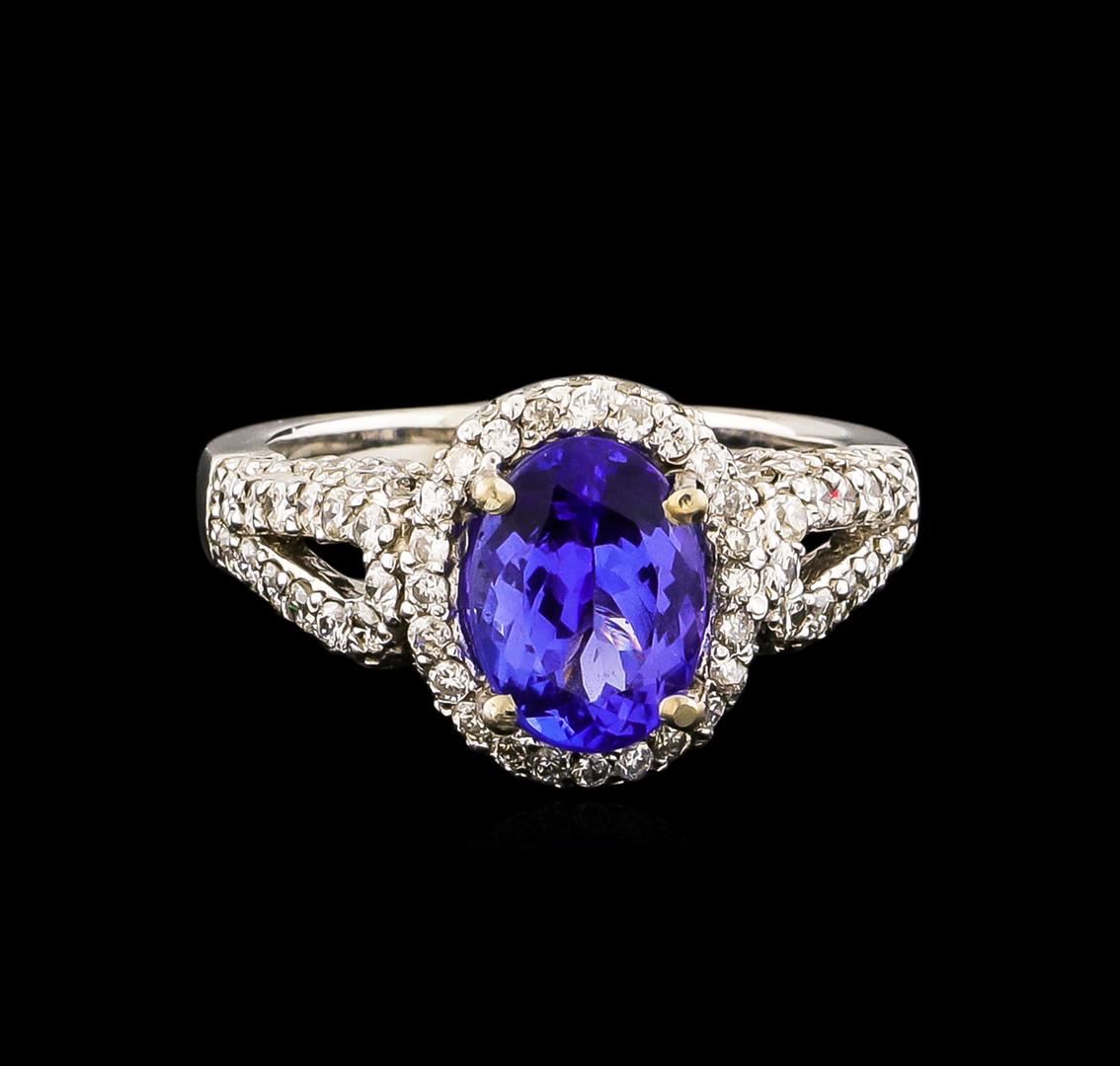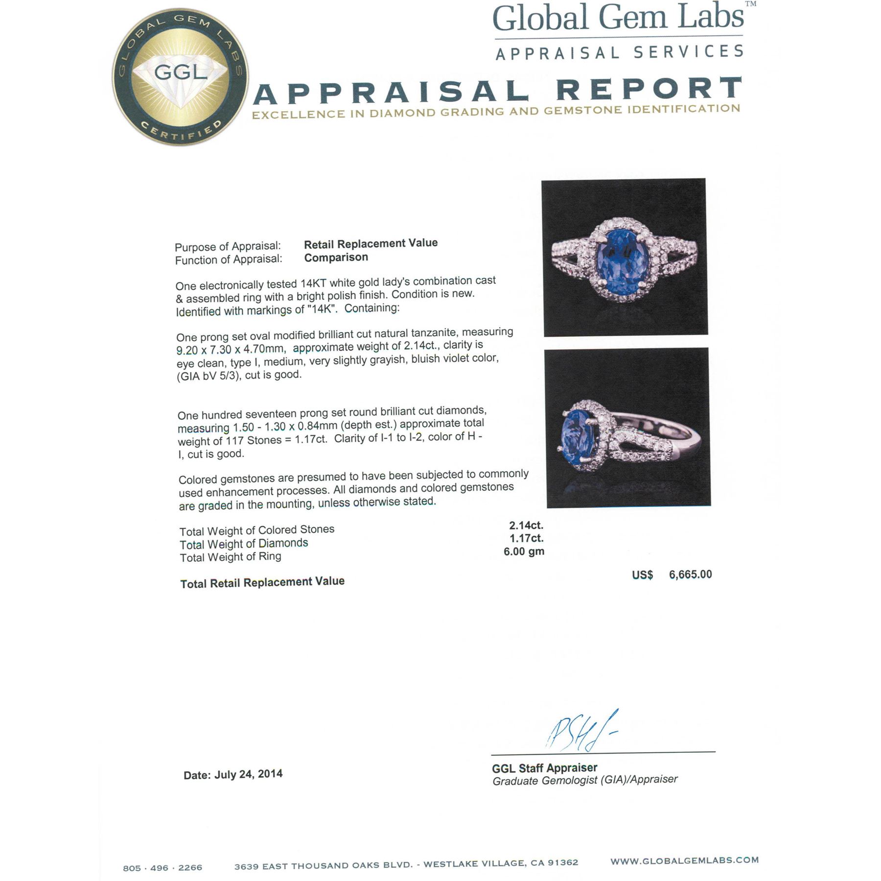 One electronically tested 14KT white gold ladies combination cast & assembled ring with a bright polish finish. Condition is new. Identified with markings of "14K". Containing: One prong set oval modified brilliant cut natural tanzanite, measuring 9.20 x 7.30 x 4.70mm, approximate weight of 2.14ct., clarity is eye clean, type I, medium, very slightly grayish, bluish violet color, (GIA bV 5/3), cut is good. One Hundred Seventeen prong set round brilliant cut diamonds, measuring 1.50 - 1.30 x 0.84mm (depth est.) approximate total weight of 117 Stones = 1.17ct. Clarity: I-1 to I-2. Color: H - I, Cut is Good. Colored gemstones are presumed to have been subjected to commonly used enhancement processes. All diamonds and colored gemstones are graded in the mounting, unless otherwise stated. Total Weight of Colored Stones 2.14ct. Total Weight of Diamonds 1.17ct. Total Weight of Ring 6.00 grams. GGL Appraised.