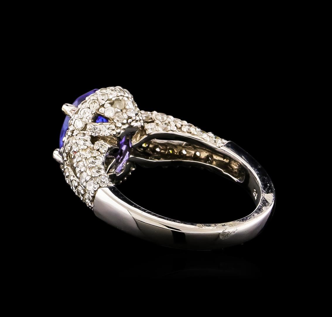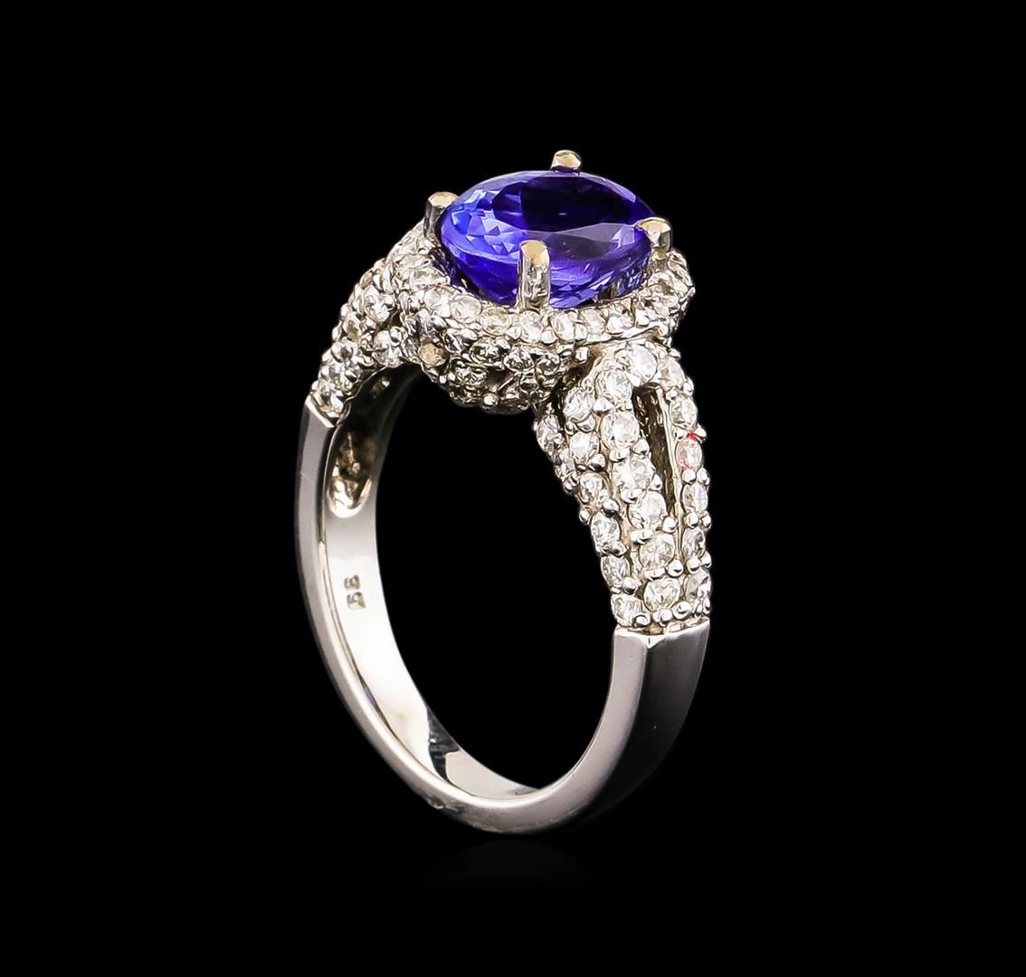 One electronically tested 14KT white gold ladies combination cast & assembled ring with a bright polish finish. Condition is new. Identified with markings of "14K". Containing: One prong set oval modified brilliant cut natural tanzanite, measuring 9.20 x 7.30 x 4.70mm, approximate weight of 2.14ct., clarity is eye clean, type I, medium, very slightly grayish, bluish violet color, (GIA bV 5/3), cut is good. One Hundred Seventeen prong set round brilliant cut diamonds, measuring 1.50 - 1.30 x 0.84mm (depth est.) approximate total weight of 117 Stones = 1.17ct. Clarity: I-1 to I-2. Color: H - I, Cut is Good. Colored gemstones are presumed to have been subjected to commonly used enhancement processes. All diamonds and colored gemstones are graded in the mounting, unless otherwise stated. Total Weight of Colored Stones 2.14ct. Total Weight of Diamonds 1.17ct. Total Weight of Ring 6.00 grams. GGL Appraised.