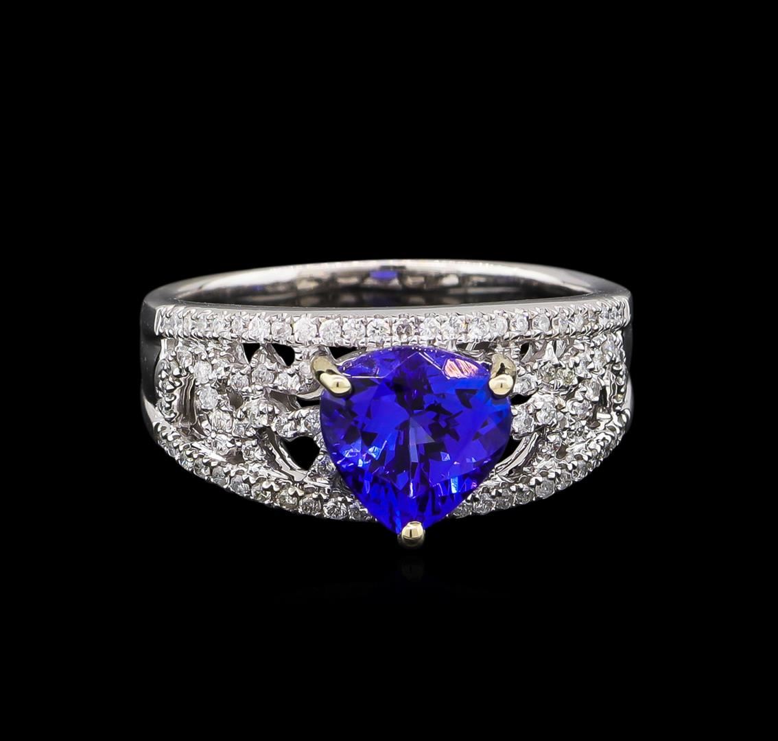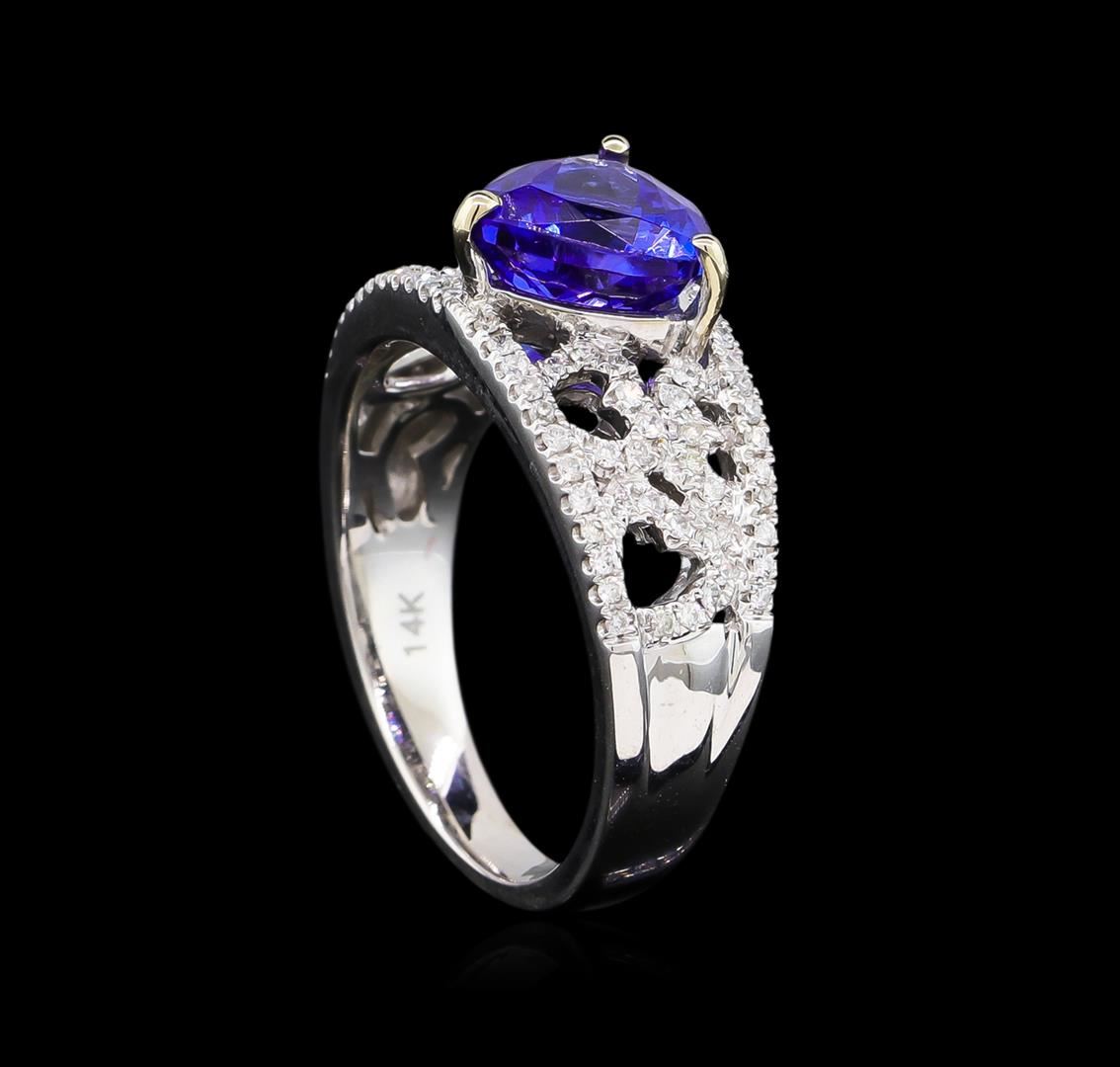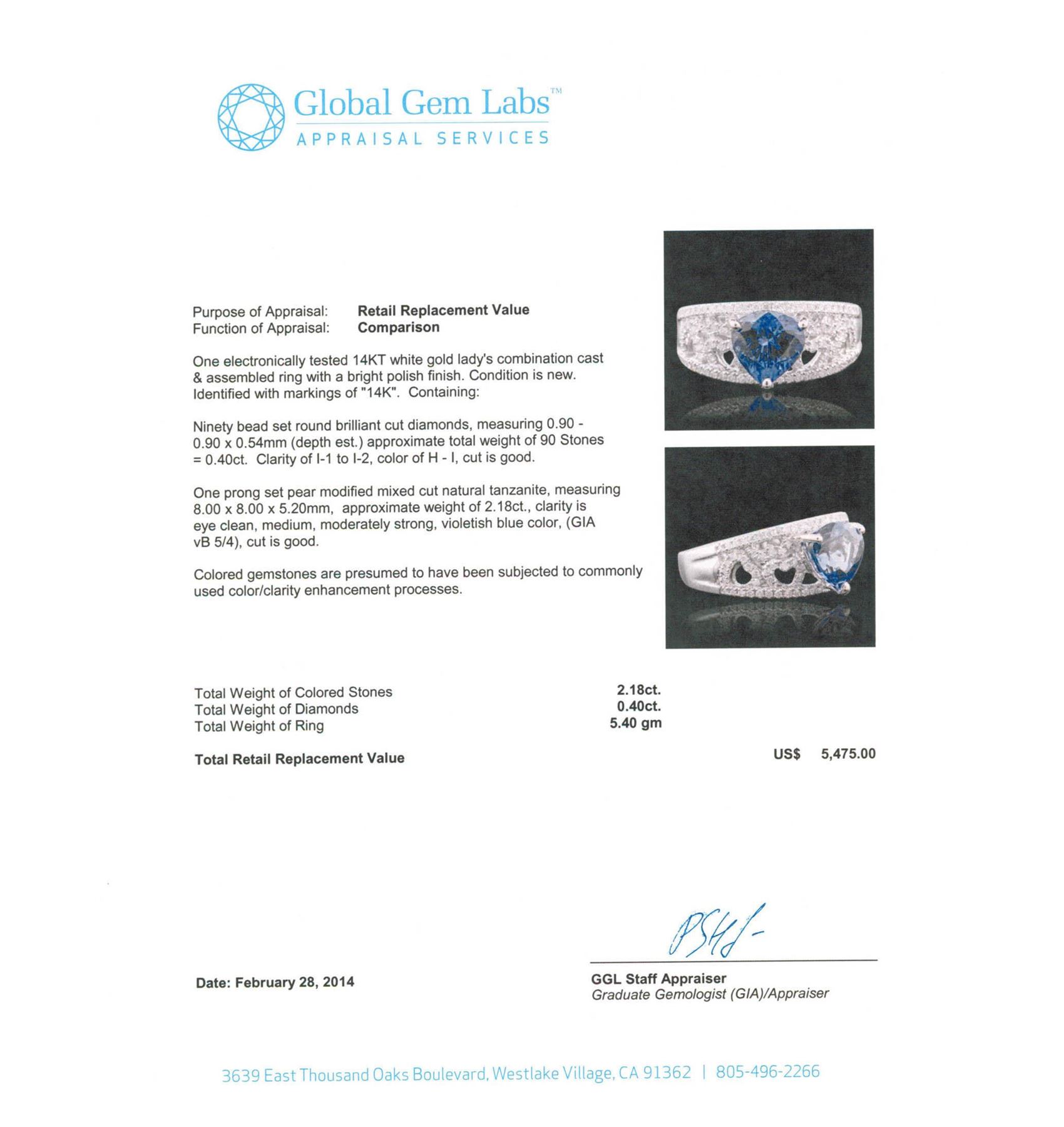 One electronically tested 14KT white gold Ladies combination cast & assembled ring with a bright polish finish. Condition is new. Identified with markings of "14K". Containing: Ninety bead set round brilliant cut diamonds, measuring 0.90 - 0.90 x 0.54mm (depth est.) approximate. Total Weight of 90 Stones = 0.40 ct. Clarity: I-1 to I-2. Color: H - I, Cut is Good. One prong set pear modified mixed cut natural tanzanite, measuring 8.00 x 8.00 x 5.20mm, approximate weight of 2.18ct., clarity is eye clean, medium, moderately strong, violetish blue color, (GIA vB 5/4), cut is good. Colored gemstones are presumed to have been subjected to commonly used color/clarity enhancement processes. Total Weight of Colored Stones 2.18ct. Total Weight of Diamonds 0.40 ct. Total Weight of Ring 5.40 grams. GGL Appraised.