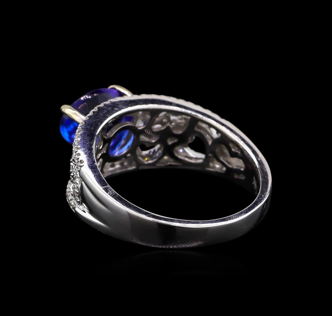 One electronically tested 14KT white gold Ladies combination cast & assembled ring with a bright polish finish. Condition is new. Identified with markings of "14K". Containing: Ninety bead set round brilliant cut diamonds, measuring 0.90 - 0.90 x 0.54mm (depth est.) approximate. Total Weight of 90 Stones = 0.40 ct. Clarity: I-1 to I-2. Color: H - I, Cut is Good. One prong set pear modified mixed cut natural tanzanite, measuring 8.00 x 8.00 x 5.20mm, approximate weight of 2.18ct., clarity is eye clean, medium, moderately strong, violetish blue color, (GIA vB 5/4), cut is good. Colored gemstones are presumed to have been subjected to commonly used color/clarity enhancement processes. Total Weight of Colored Stones 2.18ct. Total Weight of Diamonds 0.40 ct. Total Weight of Ring 5.40 grams. GGL Appraised.