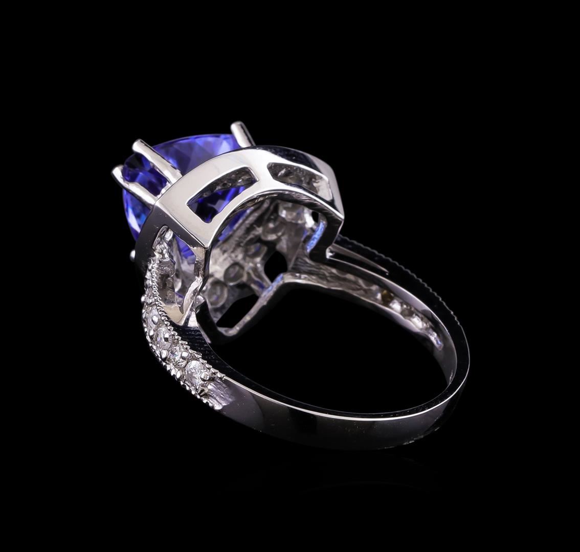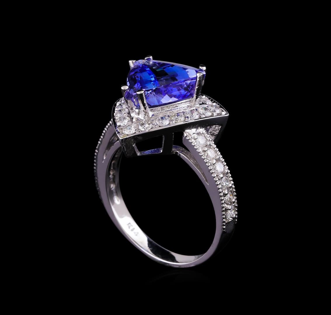 One electronically tested 14KT white gold ladies combination cast & assembled tanzanite and diamond ring with a flat shank with a bright polish finish. Identified with markings of "K14". Condition is new. Containing: One prong set triangle modified brilliant cut natural tanzanite, measuring 9.81 x 8.95 x 4.15mm, approximate weight of 2.20ct., clarity is eye clean, type I, medium, moderately strong, violet color, (GIA V 5/4), cut is good. Thirty prong set round brilliant cut diamonds, measuring 1.70 - 1.70 x 1.02mm (depth est.) approximate total weight of 30 Stones = 0.54ct. Clarity: SI-2 to I-1. Color: I - J, Cut is Good. Colored gemstones are presumed to have been subjected to commonly used enhancement processes. All diamonds and colored gemstones are graded in the mounting, unless otherwise stated. Total Weight of Colored Stones 2.20ct. Total Weight of Diamonds 0.54ct. Total Weight of Ring 5.60 grams. GGL Appraised.