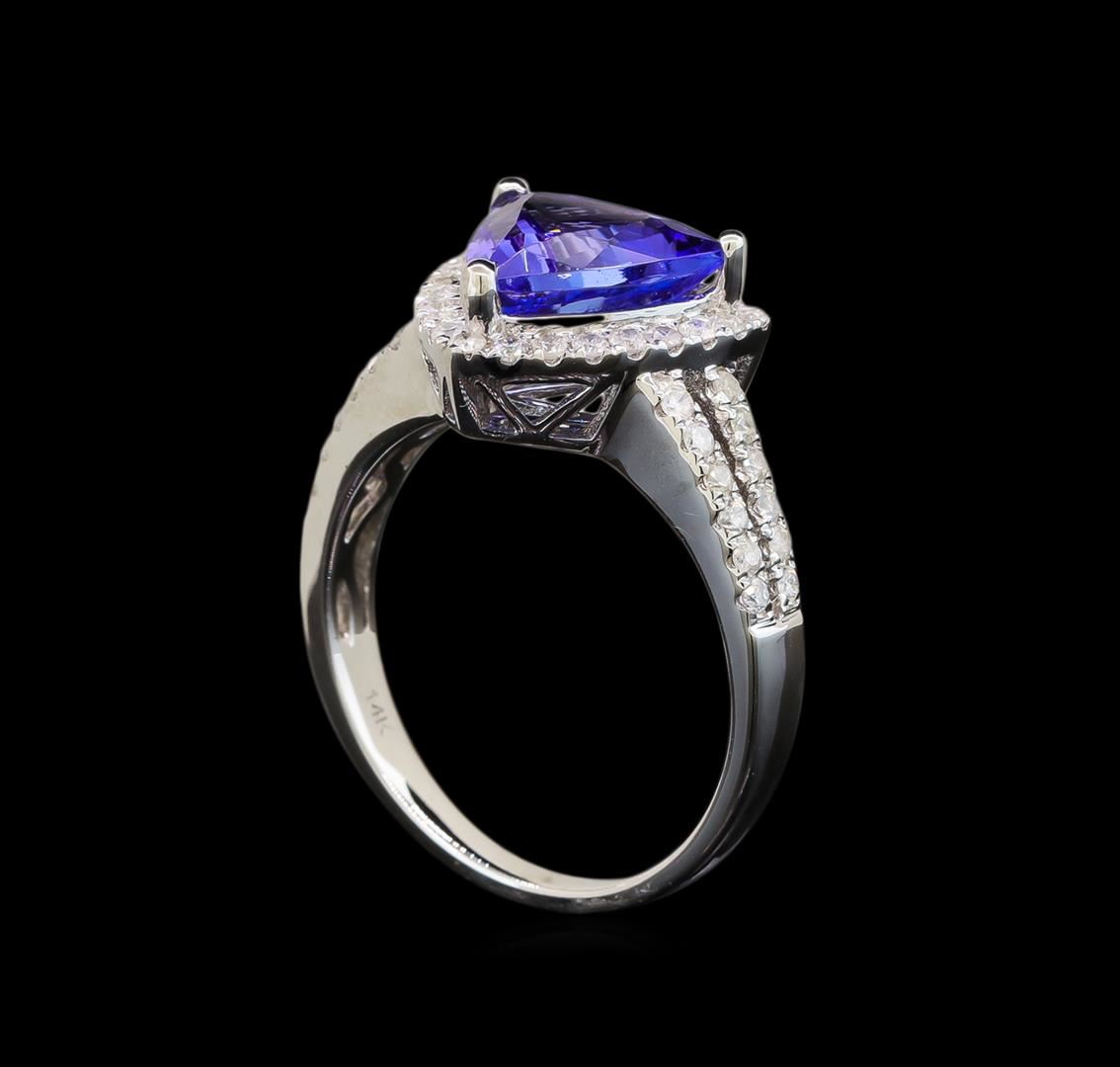One electronically tested 14KT white gold ladies cast tanzanite and diamond ring with a split shank with a bright polish finish. Trademark is Orianne. Identified with markings of "14K". Condition is new. Containing: One prong set triangle modified brilliant cut natural tanzanite, measuring 8.51 x 8.47 x 5.09mm, approximate weight of 2.21ct., clarity is eye clean, type I, medium, very slightly grayish, violet color, (GIA V 5/3), cut is good. Forty-Eight prong set round brilliant cut diamonds, measuring 1.20 - 1.20 x 0.72mm (depth est.) approximate total weight of 48 Stones = 0.30ct. Clarity: SI-2 to I-2. Color: I - J. All diamonds and colored gemstones are graded in the mounting, unless otherwise stated. Colored gemstones are presumed to have been subjected to commonly used enhancement processes. Total Weight of Colored Stones 2.21ct. Total Weight of Diamonds 0.30ct. Total Weight of Ring 4.50 grams. GGL Appraised.