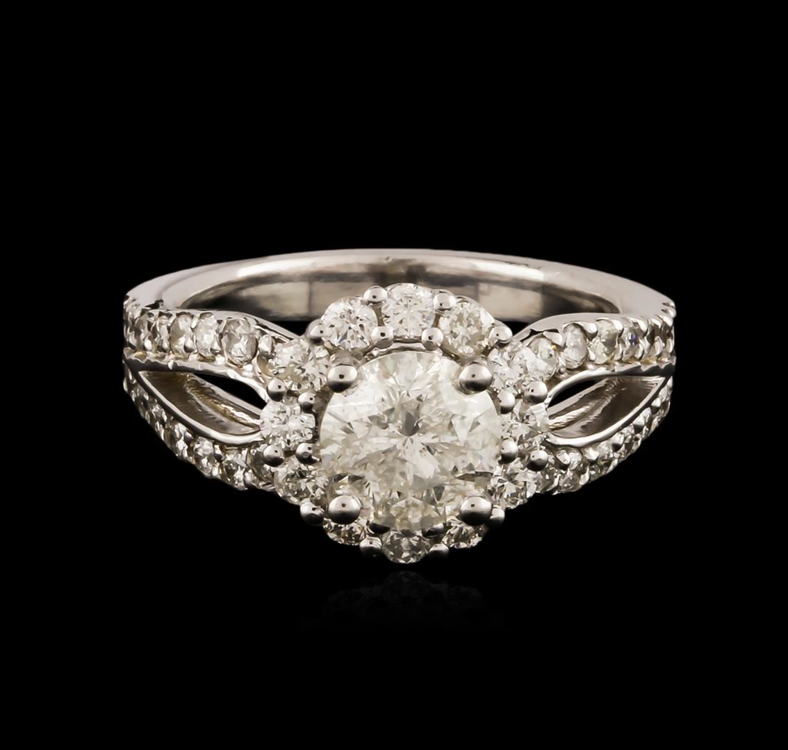 One electronically tested 14KT white gold ladies cast diamond unity ring with a bright polish finish. The featured diamond is set within a diamond bezel supported by diamond set split shoulders, completed by a grooved three millimeter wide band. Identified with markings of "14K". Condition is new, good workmanship. Containing: One prong set round brilliant cut diamond, measuring 6.55 - 6.54 x 4.15mm (depth est.) approximate weight of 1.12ct with a faint blue fluorescence. Graded in the setting. Clarity: I-1. Color: J. Depth 63.4%. Table 56.5%. Forty-Four prong set round brilliant cut diamonds, measuring 2.00 - 1.80 x 1.14mm (depth est.) approximate total weight of 44 Stones = 1.10ct. Graded in the setting. Clarity: SI-2 to I-1. Color: H - J. Total Weight of Diamonds 2.22ct. Total Weight of Ring 6.20 grams. AIG Appraised at $15,075.00.
