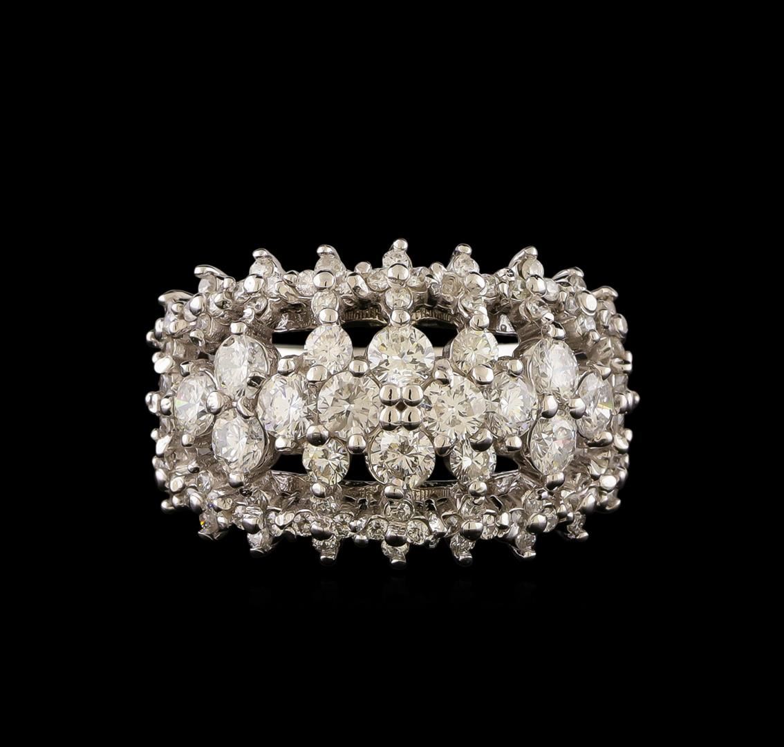 One electronically tested 14KT white gold ladies combination cast & assembled diamond ring with a bright polish finish. Identified with markings of "K14". Condition is new. Containing: Eighty prong set round brilliant cut diamonds, measuring 1.30 - 1.30 x 0.78mm (depth est.) approximate total weight of 80 Stones = 0.64ct. Clarity: I-1. Color: I - J, Cut is Good. Sixteen prong set round brilliant cut diamonds, measuring 3.50 - 2.50 x 1.80mm (depth est.) approximate total weight of 16 Stones = 1.58ct. Clarity: SI-2 to I-1. Color: H - I, Cut is Good. All diamonds are graded in the mounting, unless otherwise stated. Total Weight of Diamonds 2.22ct. Total Weight of Ring 9.50 grams. GGL Appraised.