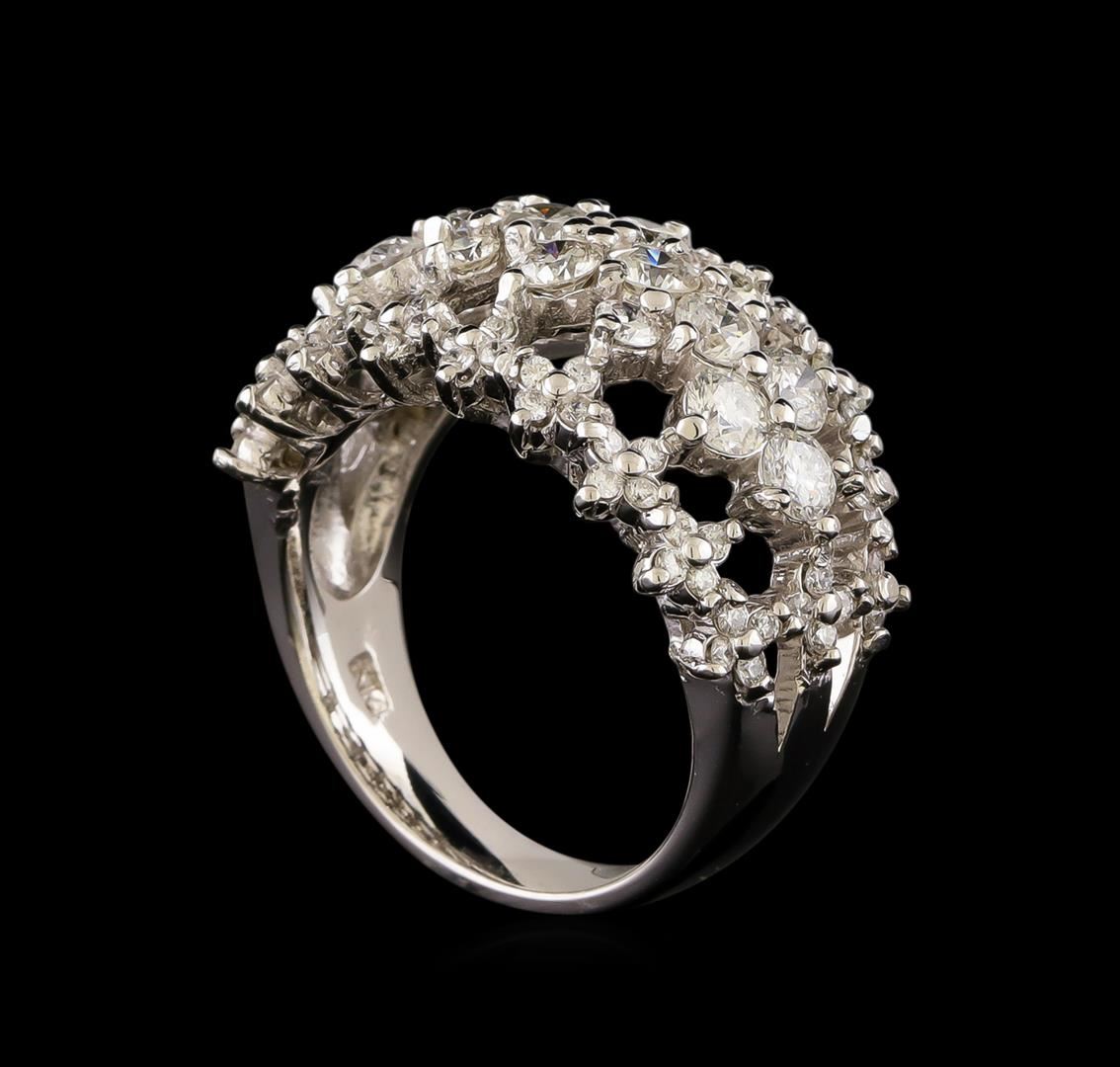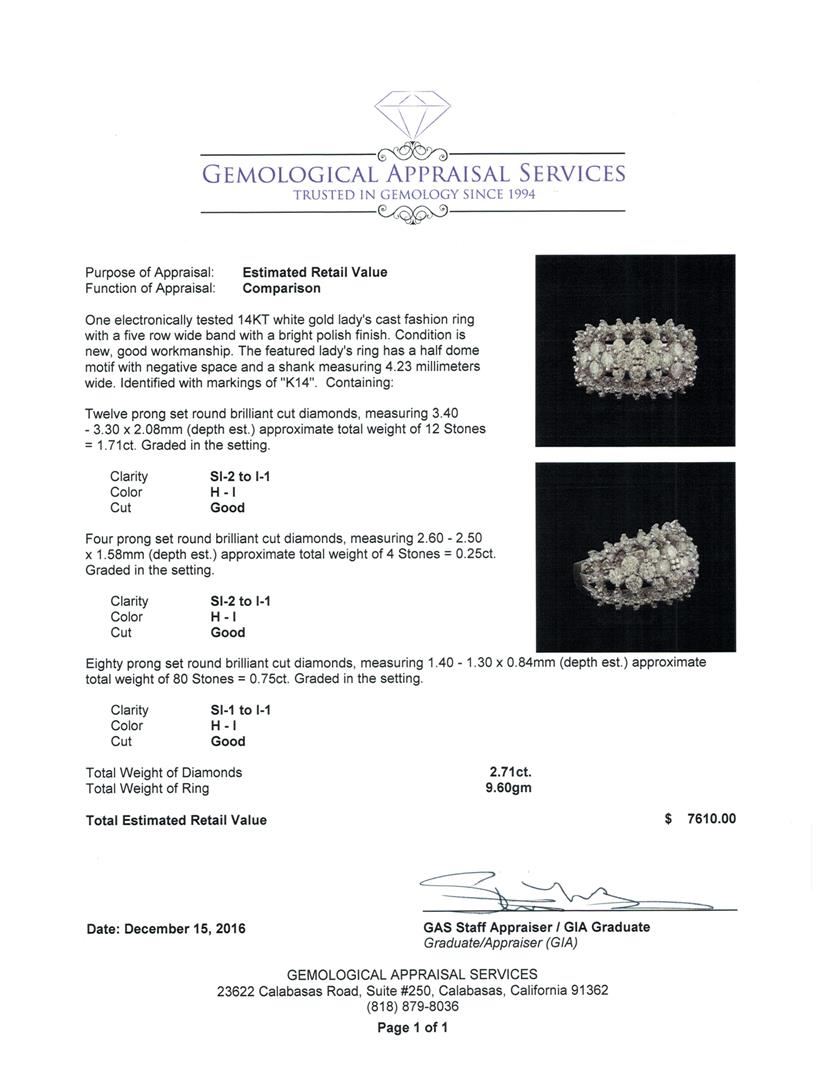 One electronically tested 14KT white gold ladies combination cast & assembled diamond ring with a bright polish finish. Identified with markings of "K14". Condition is new. Containing: Eighty prong set round brilliant cut diamonds, measuring 1.30 - 1.30 x 0.78mm (depth est.) approximate total weight of 80 Stones = 0.64ct. Clarity: I-1. Color: I - J, Cut is Good. Sixteen prong set round brilliant cut diamonds, measuring 3.50 - 2.50 x 1.80mm (depth est.) approximate total weight of 16 Stones = 1.58ct. Clarity: SI-2 to I-1. Color: H - I, Cut is Good. All diamonds are graded in the mounting, unless otherwise stated. Total Weight of Diamonds 2.22ct. Total Weight of Ring 9.50 grams. GGL Appraised.