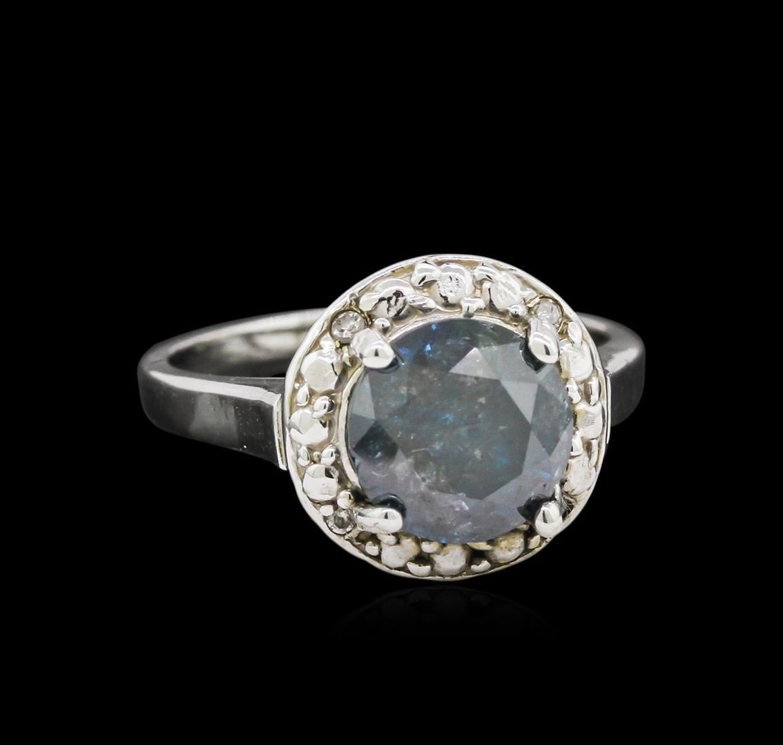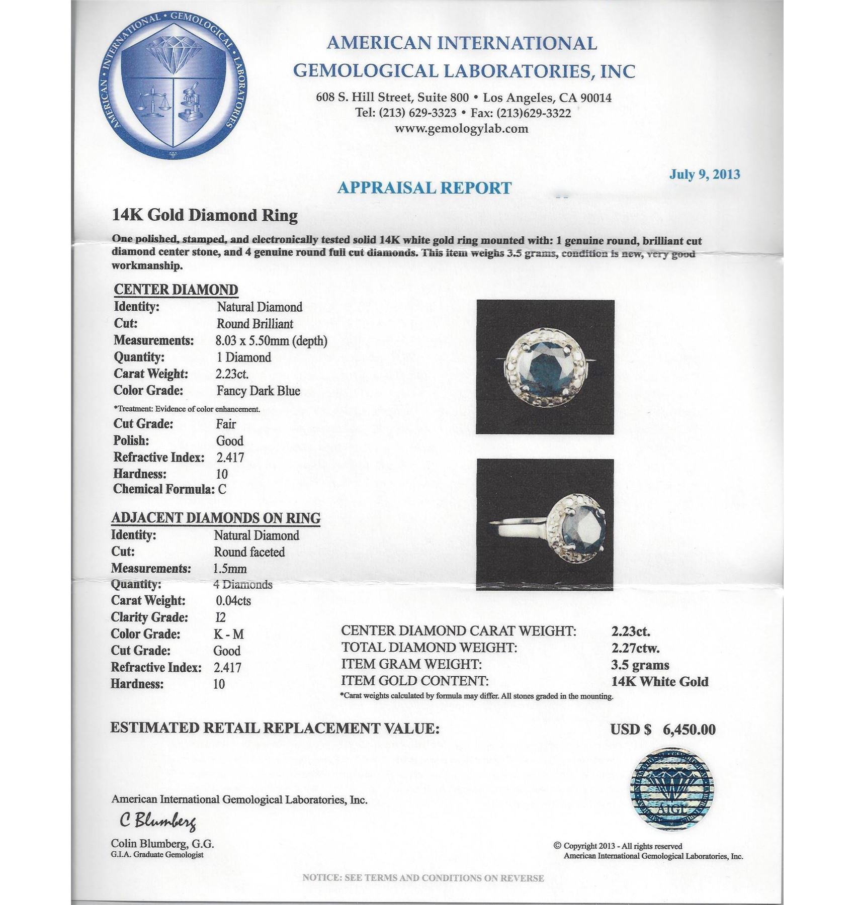 One electronically tested 14KT White Gold 2.23ct Blue Diamond Ring. One polished, stamped, and electronically tested solid 14KT white gold ring featuring: 1 genuine round, brilliant cut diamond center stone with a total weight of 2.23ct, and 4 genuine round full cut diamonds with a total weight of 2.27ctw. This item weighs 3.5 grams, condition is new, very good workmanship. AIG Appraised at $6,450.00.