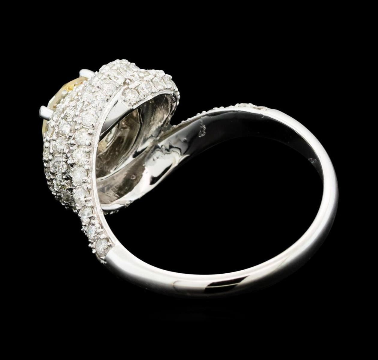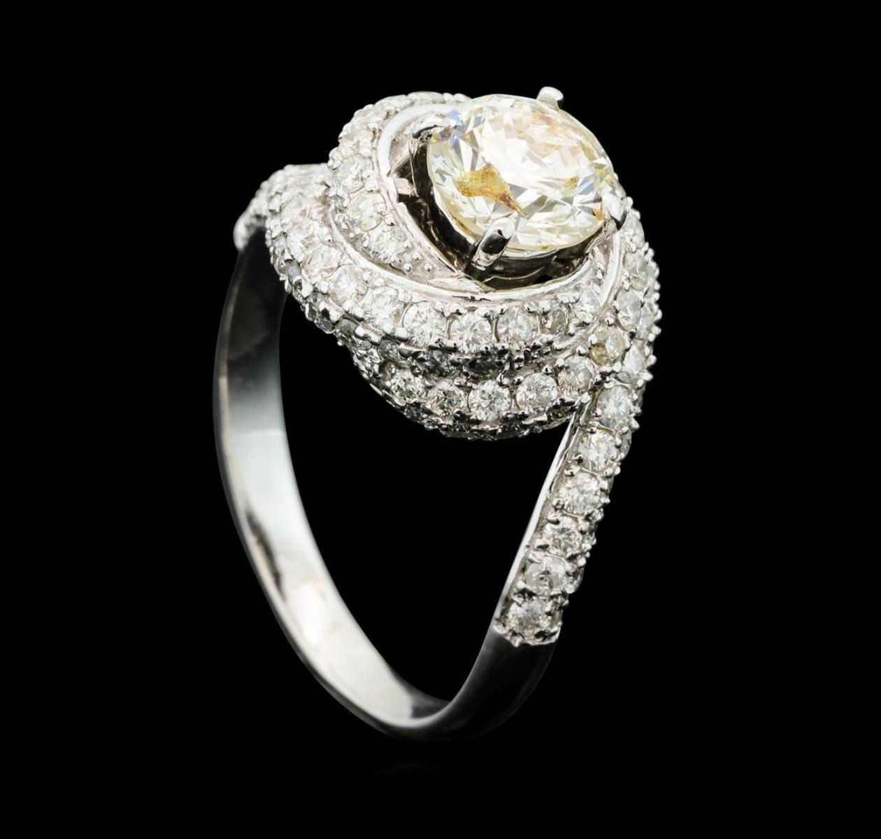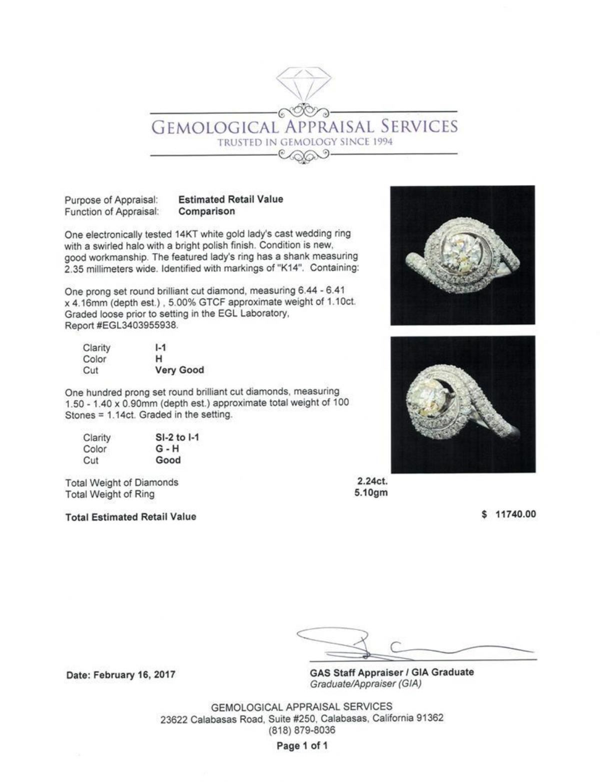 One electronically tested 14KT white gold lady's cast wedding ring with a swirled halo with a bright polish finish. The featured lady's ring has a shank measuring 2.35 millimeters wide. Identified with markings of "K14". Condition is new, good workmanship. Estimated Retail Value: $11740.00 GAS Appraised.