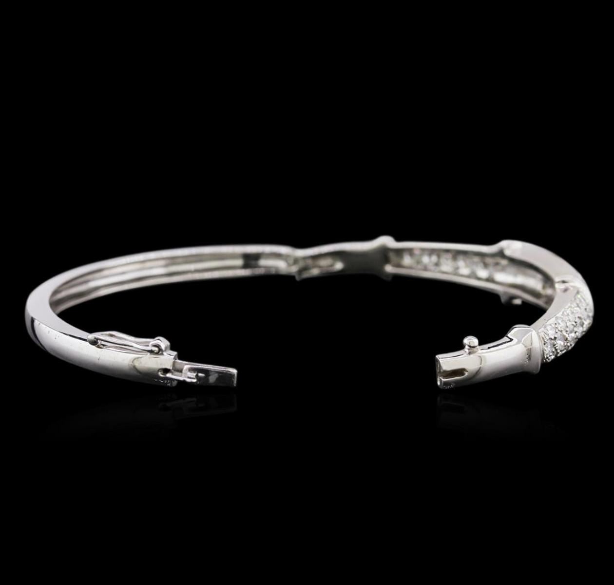One electronically tested 14KT white gold ladies cast diamond bangle bracelet with a hidden box clasp with safety closer with a bright polish finish. Identified with markings of "14K". Condition is new. Containing: Fifty-One prong set round brilliant cut diamonds, measuring 2.50 - 1.80 x 1.29mm (depth est.) approximate total weight of 51 Stones = 2.30ct. Clarity: VS-2 to SI-1. Color: H - I, Cut is Good. Diamonds are graded in the mounting, unless otherwise stated. Total Weight of Diamonds 2.30ct. Total Weight of Bangle Bracelet 20.60 grams. GGL Appraised.