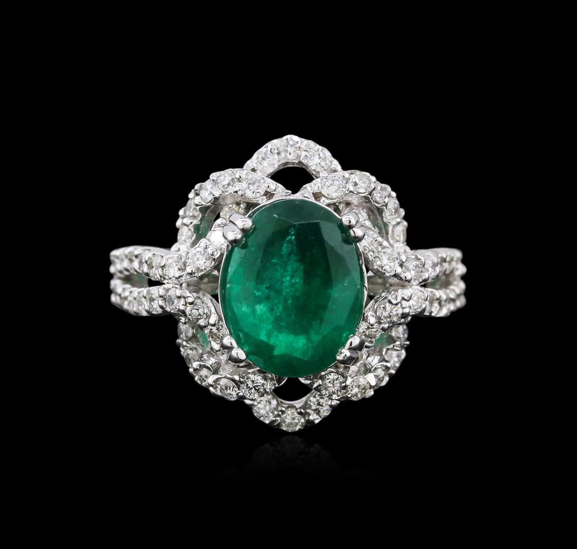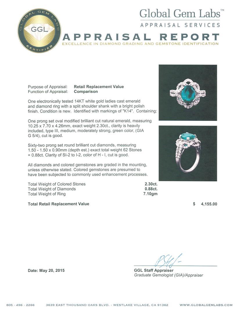 One electronically tested 14KT white gold ladies cast emerald and diamond ring with a split shoulder shank with a bright polish finish. Identified with markings of "K14". Condition is new. Containing: One prong set oval modified brilliant cut natural emerald, measuring 10.25 x 7.70 x 4.26mm, exact weight 2.30ct., clarity is heavily included, type III, medium, moderately strong, green color, (GIA G 5/4), cut is good. Sixty-Two prong set round brilliant cut diamonds, measuring 1.50 - 1.50 x 0.90mm (depth est.) exact total weight 62 Stones = 0.88ct. Clarity: SI-2 to I-2. Color: H - I, Cut is Good. All diamonds and colored gemstones are graded in the mounting, unless otherwise stated. Colored gemstones are presumed to have been subjected to commonly used enhancement processes. Total Weight of Colored Stones 2.30ct. Total Weight of Diamonds 0.88ct. Total Weight of Ring 7.10 grams. GGL Appraised.