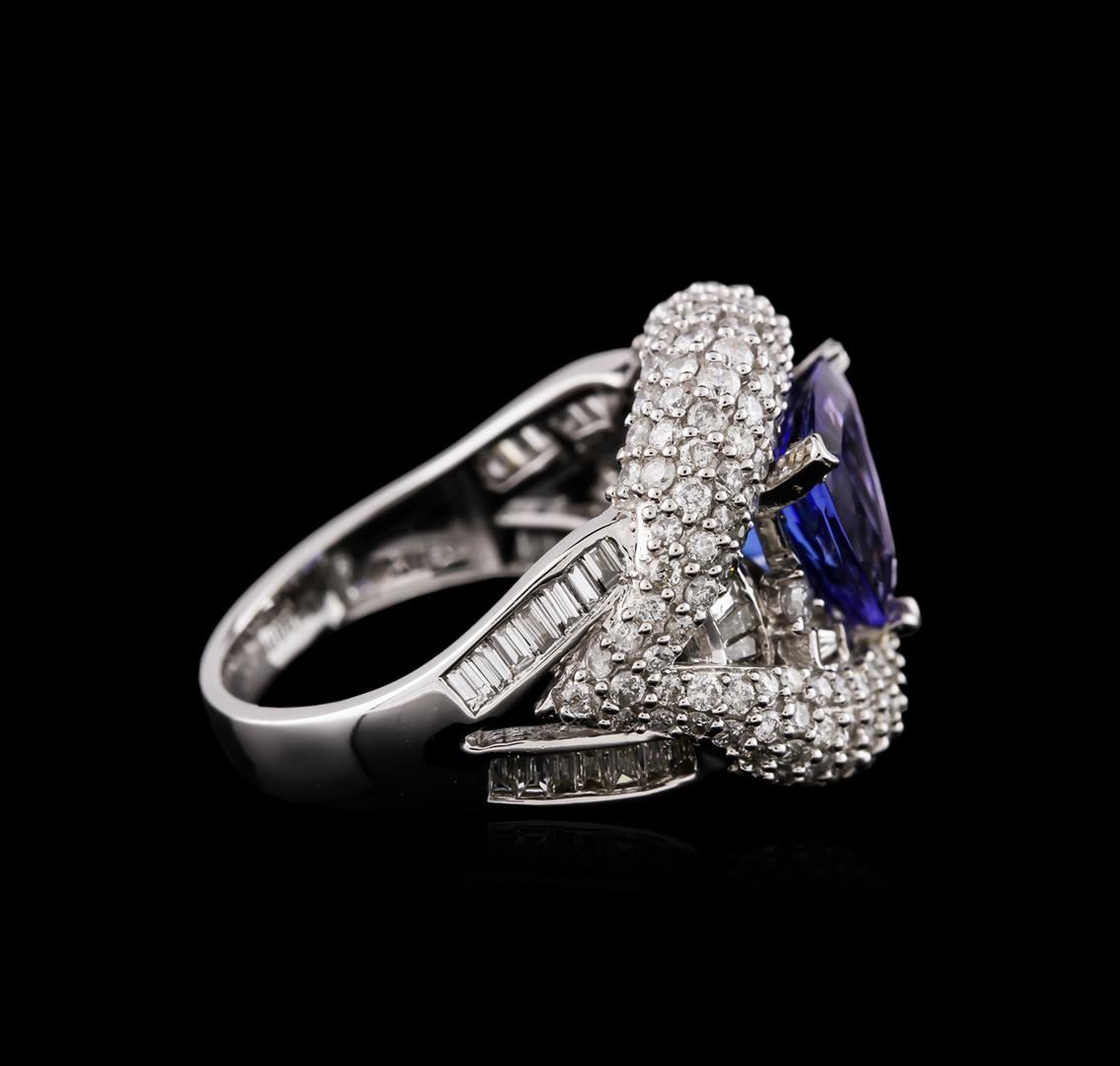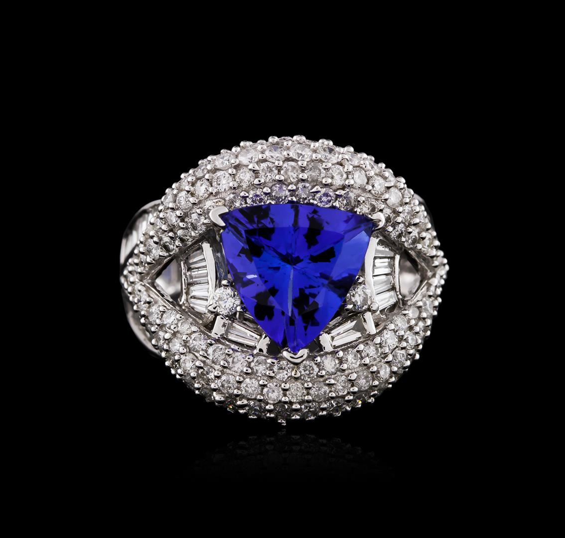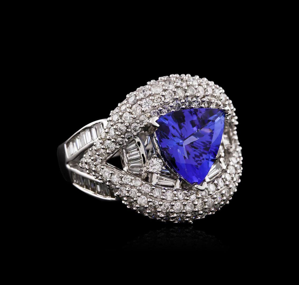 One electronically tested 14KT white gold ladies cast tanzanite and diamond ring with a bright polish finish. Identified with markings of "14K". Condition is new. Containing: One prong set triangle modified brilliant cut natural tanzanite, measuring 8.92 x 8.52 x 5.01mm, approximate weight of 2.30 ct., clarity is eye clean, type I, medium light, very slightly grayish, violet color, (GIA V 4/3), cut is good. One Hundred Forty-Four prong set round brilliant cut diamonds, measuring 1.20 - 1.20 x 0.72mm (depth est.) approximate total weight of 144 Stones = 0.91ct. Clarity: I-1 to I-2. Color: I - J. Thirty-Eight channel set baguette cut (tapered) diamonds, measuring from 1.50 x 1.20 x 1.02mm (depth est.) to 1.80 x 1.30 x 1.11mm (depth est.) approximate total weight of 38 Stones = 0.76ct. Clarity: SI-2. Color: I - J. Colored gemstones are presumed to have been subjected to commonly used enhancement processes. All diamonds and colored gemstones are graded in the mounting, unless otherwise stated. Total Weight of Colored Stones 2.30 ct. Total Weight of Diamonds 1.67ct. Total Weight of Ring 7.70 grams. GGL Appraised.
