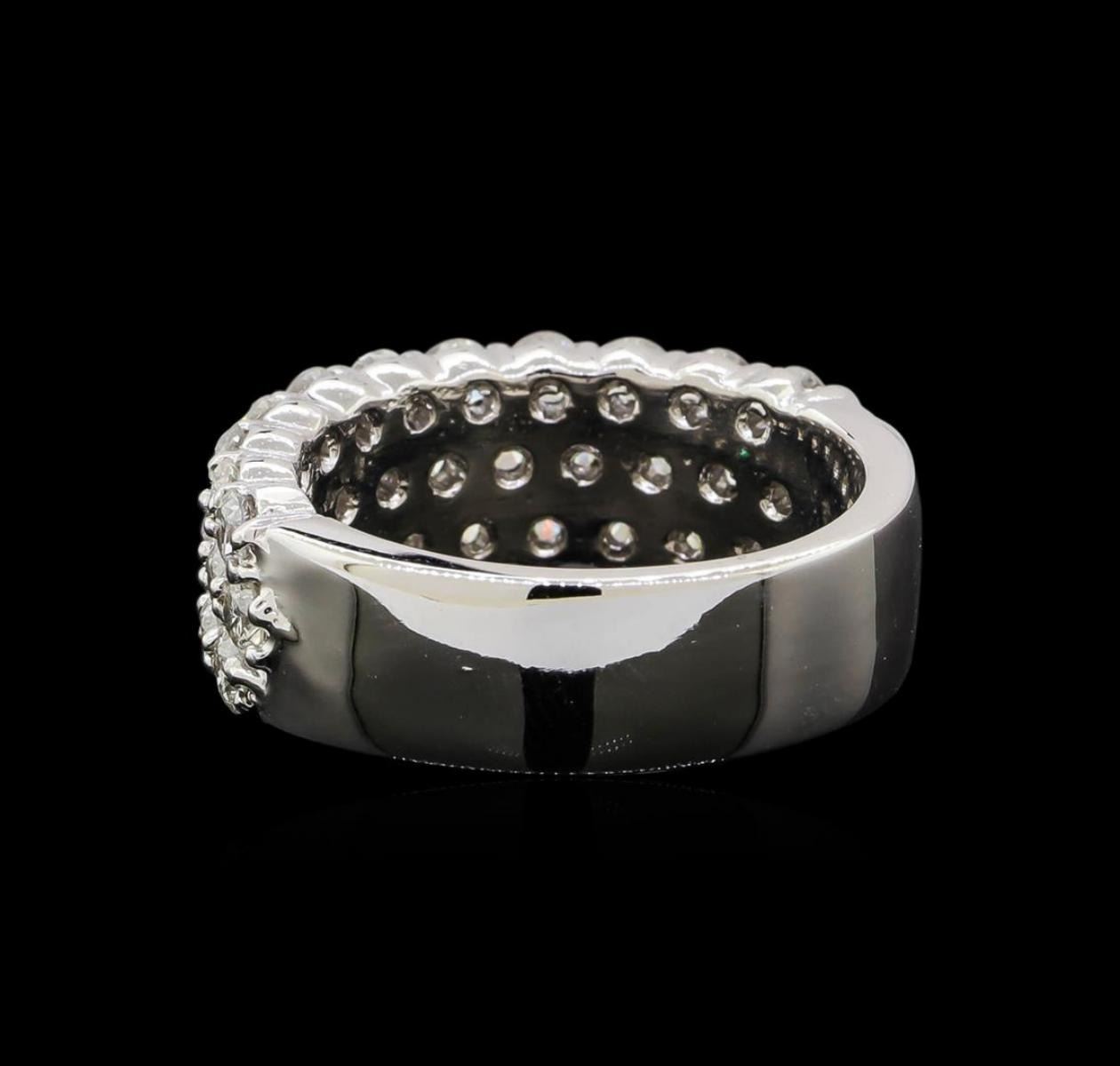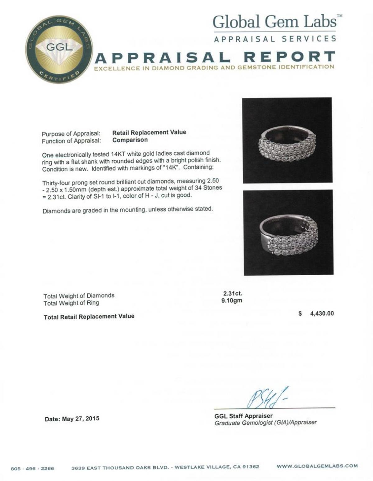 One electronically tested 14KT white gold ladies cast diamond ring with a flat shank with rounded edges with a bright polish finish. Identified with markings of "14K". Condition is new. Containing: Thirty-Four prong set round brilliant cut diamonds, measuring 2.50 - 2.50 x 1.50mm (depth est.) approximate total weight of 34 Stones = 2.31ct. Clarity: SI-1 to I-1. Color: H - J, Cut is Good. Diamonds are graded in the mounting, unless otherwise stated. Total Weight of Diamonds 2.31ct. Total Weight of Ring 9.10 grams. GGL Appraised at $4,430.00.