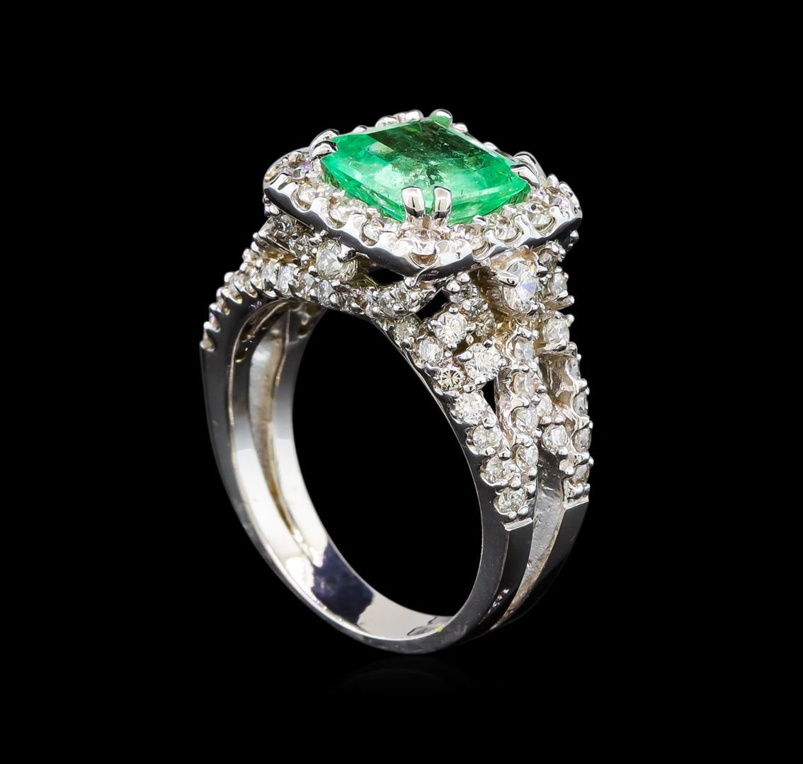 One electronically tested 14KT white gold ladies cast emerald and diamond ring with a bright polish finish. Condition is new. Containing: One prong set emerald standard step cut natural emerald, measuring 8.34 x 8.07 x 4.67mm, approximate weight of 2.31ct., clarity is moderately included, type III, light, very slightly grayish, very slightly bluish green color, (GIA vslbG 3/3), cut is good. Four prong set round brilliant cut diamonds, measuring 2.50 - 2.50 x 1.50mm (depth est.) approximate total weight of 4 Stones = 0.23ct. Clarity: SI-1 to SI-2. Color: I - J, Cut is Good. Ninety-Two prong set round brilliant cut diamonds, measuring 1.80 - 1.30 x 0.93mm (depth est.) approximate total weight of 92 Stones = 1.25ct. Clarity: SI-2 to I-2. Color: I - J, Cut is Good. Colored gemstones are presumed to have been subjected to commonly used enhancement processes. All diamonds and colored gemstones are graded in the mounting, unless otherwise stated. Total Weight of Colored Stones 2.31ct. Total Weight of Diamonds 1.48ct. Total Weight of Ring 8.20 grams. GGL Appraised.
