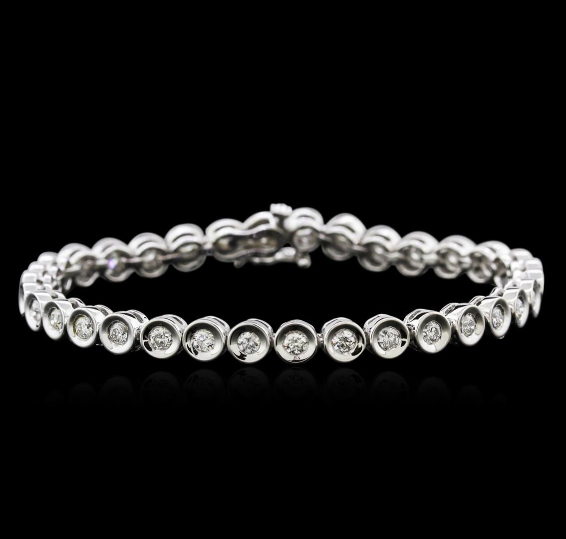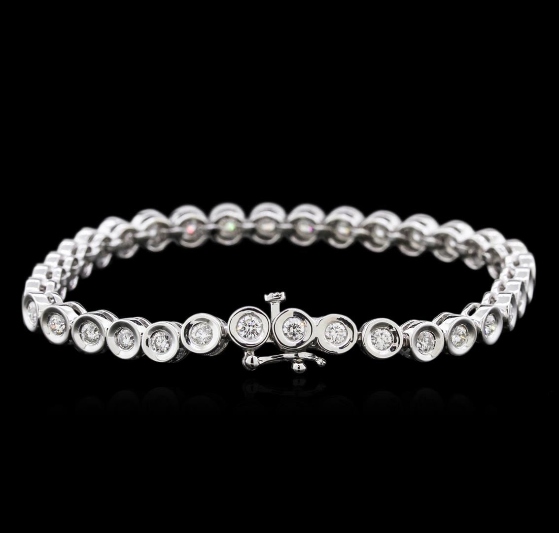 One electronically tested 14KT white gold ladies cast diamond tennis bracelet with a hidden box clasp with safety closer with a bright polish finish. Measurements: 7" in length Identified with markings of "14K". Condition is new. Containing: Thirty-Four bezel set round brilliant cut diamonds, measuring 2.80 - 2.80 x 1.68mm (depth est.) approximate total weight of 34 Stones = 2.32ct. Clarity: SI-1 to I-1. Color: I - J, Cut is Good. Diamonds are graded in the mounting, unless otherwise stated. Total Weight of Diamonds 2.32ct. Total Weight of Tennis Bracelet 17.14 grams. GGL Appraised at $5,350.00.