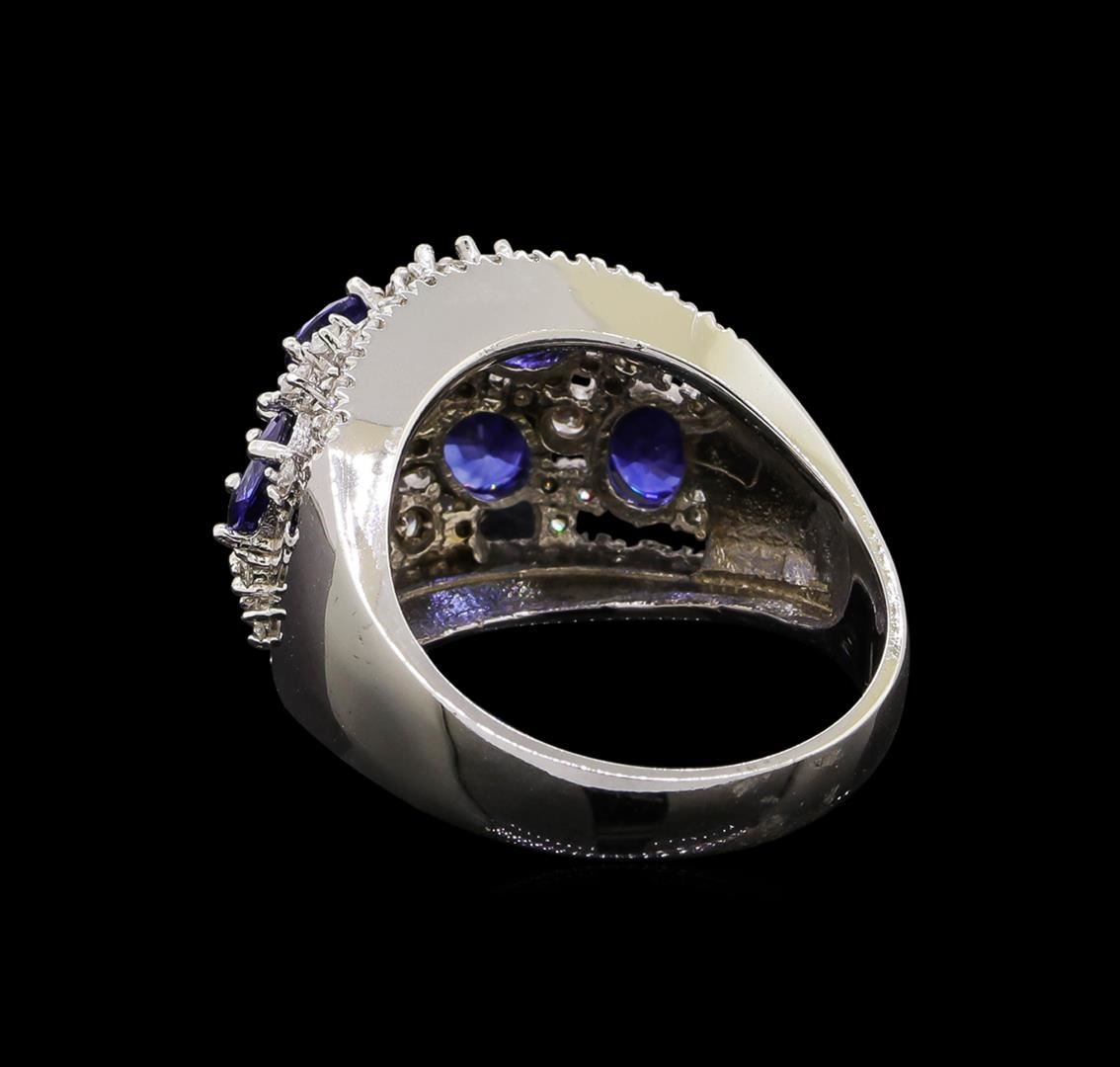 One electronically tested 14KT white gold ladies cast sapphire and diamond ring with a bright polish finish. Identified with markings of "K14". Condition is new. Containing: Six prong set oval modified brilliant cut natural blue sapphires, measuring 5.00 x 3.80 x 2.47mm, approximate total weight of 2.34ct., clarity is eye clean, type II, medium, moderately strong, blue color, (GIA B 5/4), cut is very good. Fifty-Eight prong set round brilliant cut diamonds, measuring 2.00 - 1.30 x 0.99mm (depth est.) approximate total weight of 58 Stones = 0.60ct. Clarity: SI-2 to I-2. Color: H - I, Cut is Good. Colored gemstones are presumed to have been subjected to commonly used enhancement processes. All diamonds and colored gemstones are graded in the mounting, unless otherwise stated. Total Weight of Colored Stones 2.34ct. Total Weight of Diamonds 0.60ct. Total Weight of Ring 8.00 grams. GGL Appraised.