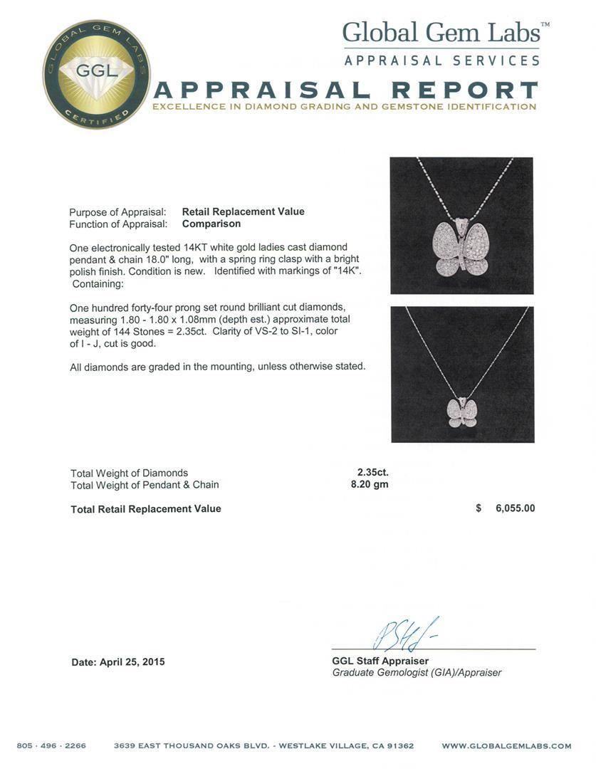 One electronically tested 14KT white gold ladies cast diamond pendant & chain 18.0" long, with a spring ring clasp with a bright polish finish. Identified with markings of "14K". Condition is new. Containing: One Hundred Forty-Four prong set round brilliant cut diamonds, measuring 1.80 - 1.80 x 1.08mm (depth est.) approximate total weight of 144 Stones = 2.35ct. Clarity: VS-2 to SI-1. Color: I - J, Cut is Good. All diamonds are graded in the mounting, unless otherwise stated. Total Weight of Diamonds 2.35ct. Total Weight of Pendant & Chain 8.20 grams. GGL Appraised.
