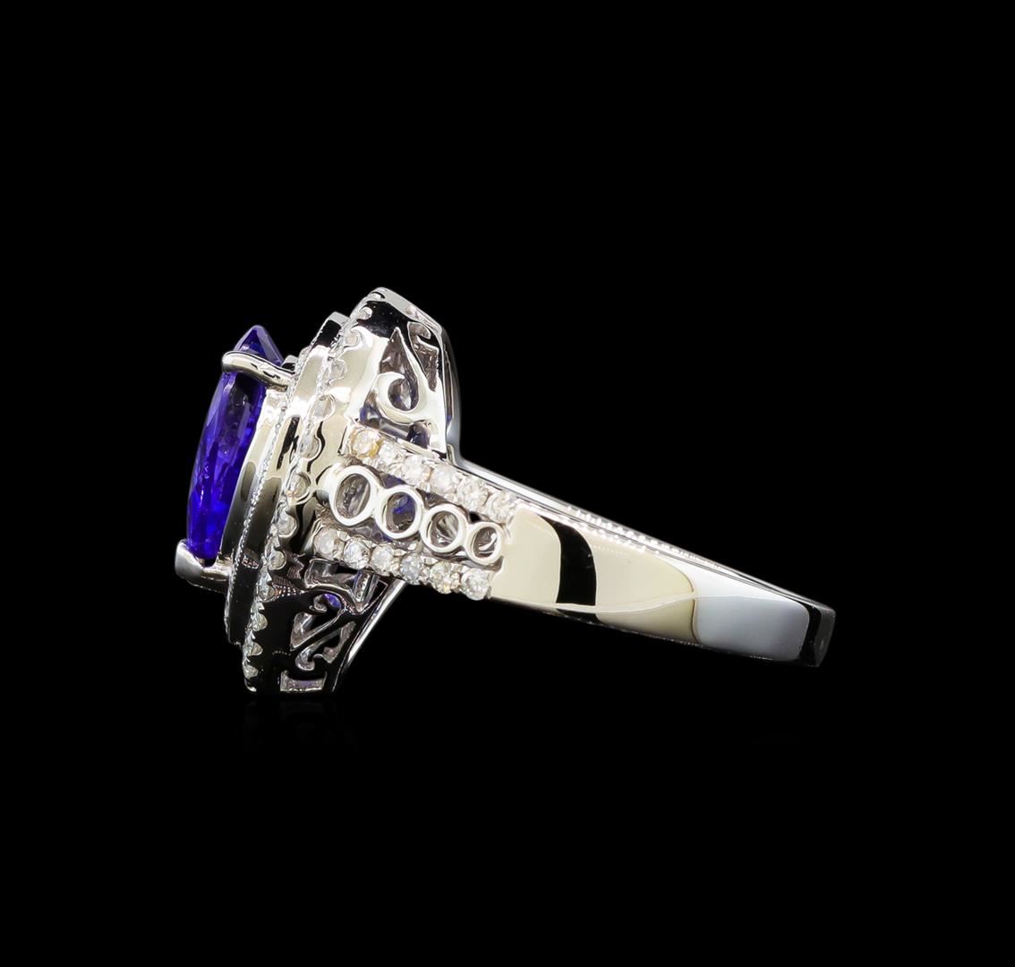 One electronically tested 14KT white gold ladies cast tanzanite and diamond ring with a bright polish finish. Identified with markings of "14K". Condition is new. Containing: One prong set pear modified brilliant cut natural tanzanite, measuring 11.00 x 7.00 x 4.55mm, approximate weight of 2.35ct., clarity is eye clean, type I, medium, moderately strong, violetish blue color, (GIA vB 5/4), cut is good. Seventy-Six prong set round brilliant cut diamonds, measuring 1.50 - 1.50 x 0.90mm (depth est.) approximate total weight of 76 Stones = 0.89ct. Clarity: SI-2 to I-2. Color: I - J. Colored gemstones are presumed to have been subjected to commonly used enhancement processes. All diamonds and colored gemstones are graded in the mounting, unless otherwise stated. Total Weight of Colored Stones 2.35ct. Total Weight of Diamonds 0.89ct. Total Weight of Ring 6.60 grams. GGL Appraised.