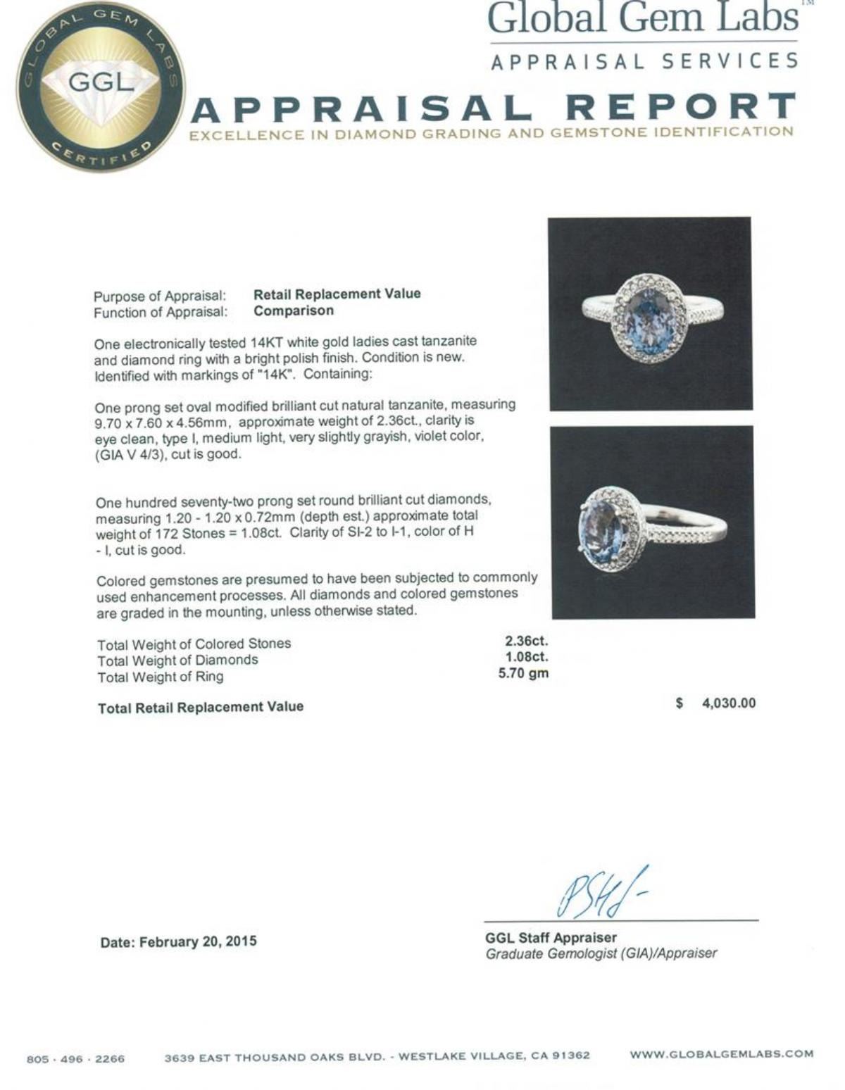 One electronically tested 14KT white gold ladies cast tanzanite and diamond ring with a bright polish finish. Identified with markings of "14K". Condition is new. Containing: One prong set oval modified brilliant cut natural tanzanite, measuring 9.70 x 7.60 x 4.56mm, approximate weight of 2.36ct., clarity is eye clean, type I, medium light, very slightly grayish, violet color, (GIA V 4/3), cut is good. One Hundred Seventy-Two prong set round brilliant cut diamonds, measuring 1.20 - 1.20 x 0.72mm (depth est.) approximate total weight of 172 Stones = 1.08ct. Clarity: SI-2 to I-1. Color: H - I, Cut is Good. Colored gemstones are presumed to have been subjected to commonly used enhancement processes. All diamonds and colored gemstones are graded in the mounting, unless otherwise stated. Total Weight of Colored Stones 2.36ct. Total Weight of Diamonds 1.08ct. Total Weight of Ring 5.70 grams. GGL Appraised.