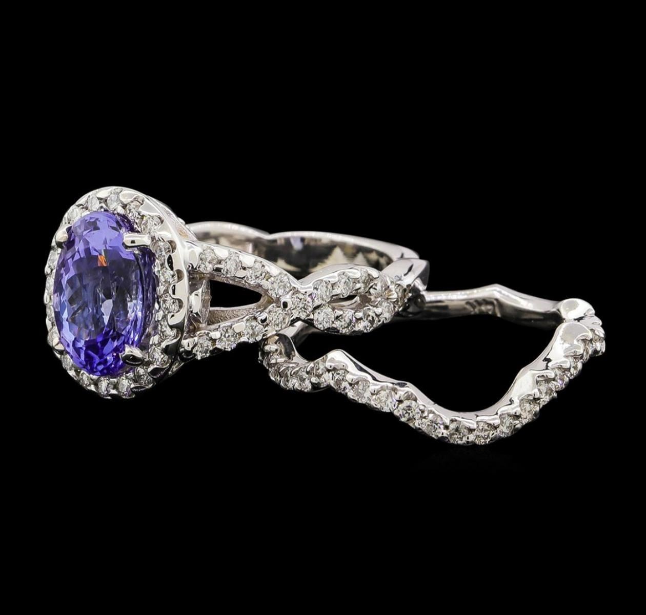 One electronically tested 14KT white gold ladies cast tanzanite and diamond ring and guard with a bright polish finish. Identified with markings of "14K". Condition is new. Containing: One prong set oval modified brilliant cut natural tanzanite, measuring 10.01 x 7.89 x 4.27mm, approximate weight of 2.37ct., clarity is eye clean, type I, medium light, very slightly grayish, violet color, (GIA V 4/3), cut is good. Forty-Six prong set round brilliant cut diamonds, measuring 1.50 - 1.50 x 0.90mm (depth est.) approximate total weight of 46 Stones = 0.57ct. Clarity: SI-2 to I-1. Color: I - J, Cut is Good. Colored gemstones are presumed to have been subjected to commonly used enhancement processes. All diamonds and colored gemstones are graded in the mounting, unless otherwise stated. Total Weight of Colored Stones 2.37ct. Total Weight of Diamonds 0.57ct. Total Weight of Ring and Guard 6.90 grams. GGL Appraised.