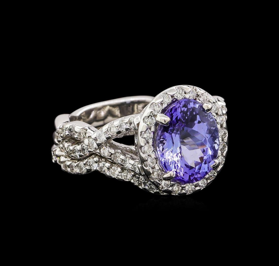 One electronically tested 14KT white gold ladies cast tanzanite and diamond ring and guard with a bright polish finish. Identified with markings of "14K". Condition is new. Containing: One prong set oval modified brilliant cut natural tanzanite, measuring 10.01 x 7.89 x 4.27mm, approximate weight of 2.37ct., clarity is eye clean, type I, medium light, very slightly grayish, violet color, (GIA V 4/3), cut is good. Forty-Six prong set round brilliant cut diamonds, measuring 1.50 - 1.50 x 0.90mm (depth est.) approximate total weight of 46 Stones = 0.57ct. Clarity: SI-2 to I-1. Color: I - J, Cut is Good. Colored gemstones are presumed to have been subjected to commonly used enhancement processes. All diamonds and colored gemstones are graded in the mounting, unless otherwise stated. Total Weight of Colored Stones 2.37ct. Total Weight of Diamonds 0.57ct. Total Weight of Ring and Guard 6.90 grams. GGL Appraised.