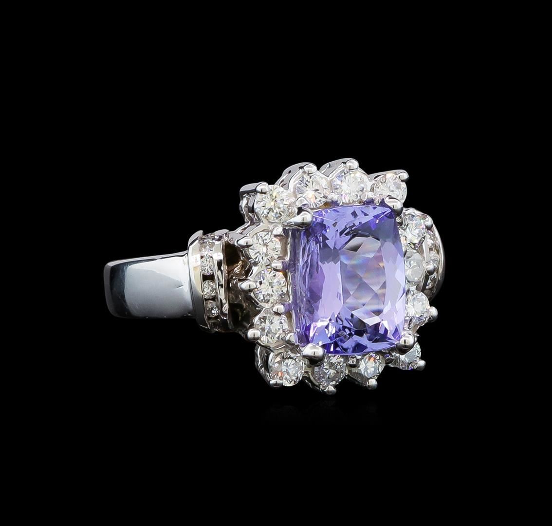One electronically tested 14KT white gold ladies cast tanzanite and diamond ring with a bright polish finish. Identified with markings of "14K". Condition is new. Containing: One prong set rectangular cushion modified brilliant cut natural tanzanite, measuring 9.20 x 7.00 x 4.55mm, approximate weight of 2.38ct., clarity is eye clean, type I, light, slightly grayish, violet color, (GIA V 3/2), cut is good. Fourteen prong set round brilliant cut diamonds, measuring 2.00 - 2.00 x 1.20mm (depth est.) approximate total weight of 14 Stones = 0.52ct. Clarity: SI-1 to SI-2. Color: I - J, Cut is Good. Colored gemstones are presumed to have been subjected to commonly used enhancement processes. All diamonds and colored gemstones are graded in the mounting, unless otherwise stated. Total Weight of Colored Stones 2.38ct. Total Weight of Diamonds 0.52ct. Total Weight of Ring 7.60 grams. GGL Appraised.