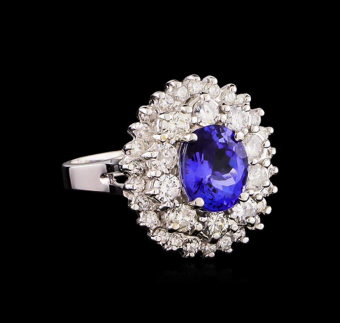 One electronically tested 14KT white gold Ladies cast ring with a bright polish finish. Condition is new. Identified with markings of "14K". Containing: One prong set oval modified brilliant cut natural tanzanite, measuring 9.10 x 7.50 x 5.15mm, approximate weight of 2.38ct., clarity is eye clean, type I, medium, moderately strong, violet color, (GIA V 5/4), cut is good. Colored gemstones are presumed to have been subjected to commonly used color/clarity enhancement processes. Twenty-Six prong set round brilliant cut diamonds, measuring 1.90 - 1.90 x 1.14mm (depth est.) approximate. Total Weight of 26 Stones = 0.65ct. Clarity: I-1 to I-2. Color: H - I, Cut is Good. All grading of diamonds and colored gemstones in this piece of jewelry are graded in the mounting, unless otherwise stated. Ten prong set round brilliant cut diamonds, measuring 2.90 - 2.90 x 1.74mm (depth est.) approximate. Total Weight of 10 Stones = 0.89ct. Clarity: SI-2 to I-1. Color: I - J, Cut is Good. All grading of diamonds and colored gemstones in this piece of jewelry are graded in the mounting, unless otherwise stated. Total Weight of Colored Stones 2.38ct. Total Weight of Diamonds 1.55ct. Total Weight of Ring 8.40 grams. GGL Appraised.