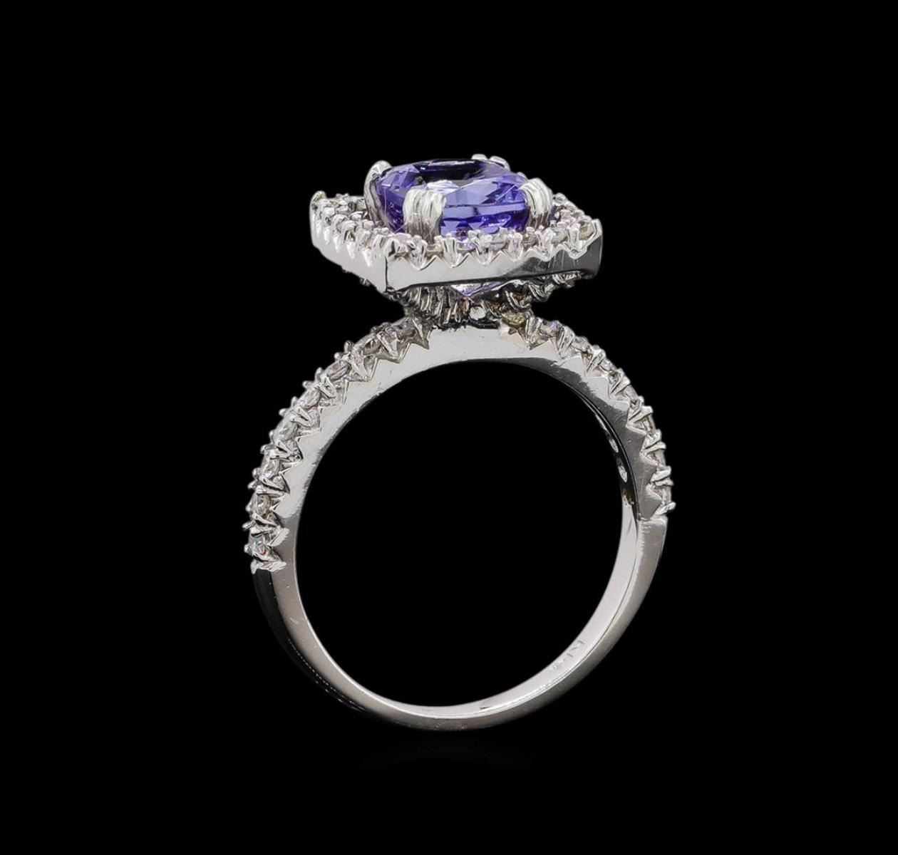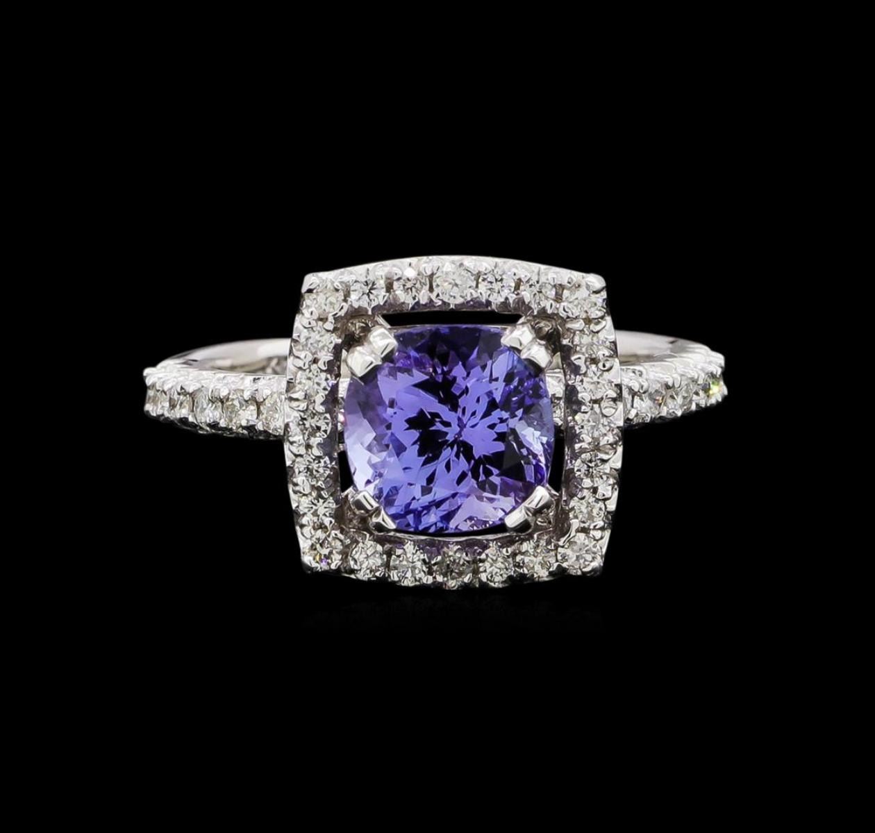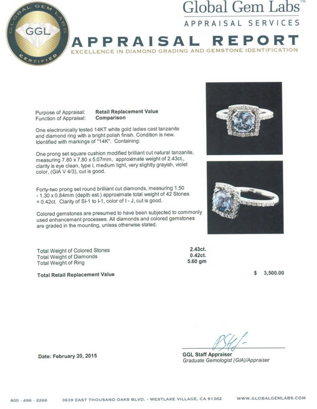 One electronically tested 14KT white gold ladies cast tanzanite and diamond ring with a bright polish finish. Identified with markings of "14K". Condition is new. Containing: One prong set square cushion modified brilliant cut natural tanzanite, measuring 7.80 x 7.80 x 5.07mm, approximate weight of 2.43ct., clarity is eye clean, type I, medium light, very slightly grayish, violet color, (GIA V 4/3), cut is good. Forty-Two prong set round brilliant cut diamonds, measuring 1.50 - 1.30 x 0.84mm (depth est.) approximate total weight of 42 Stones = 0.42ct. Clarity: SI-1 to I-1. Color: I - J, Cut is Good. Colored gemstones are presumed to have been subjected to commonly used enhancement processes. All diamonds and colored gemstones are graded in the mounting, unless otherwise stated. Total Weight of Colored Stones 2.43ct. Total Weight of Diamonds 0.42ct. Total Weight of Ring 5.60 grams. GGL Appraised at $3,500.00.