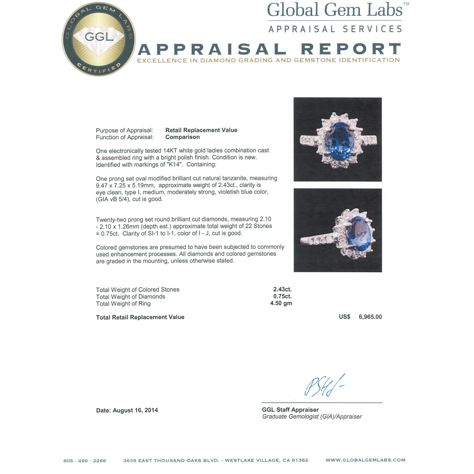 One electronically tested 14KT white gold ladies combination cast & assembled ring with a bright polish finish. Condition is new. Identified with markings of "K14". Containing: One prong set oval modified brilliant cut natural tanzanite, measuring 9.47 x 7.25 x 5.19mm, approximate weight of 2.43ct., clarity is eye clean, type I, medium, moderately strong, violetish blue color, (GIA vB 5/4), cut is good. Twenty-Two prong set round brilliant cut diamonds, measuring 2.10 - 2.10 x 1.26mm (depth est.) approximate. Total Weight of 22 Stones = 0.75ct. Clarity: SI-1 to I-1. Color: I - J, Cut is Good. Colored gemstones are presumed to have been subjected to commonly used enhancement processes. All diamonds and colored gemstones are graded in the mounting, unless otherwise stated. Total Weight of Colored Stones 2.43ct. Total Weight of Diamonds 0.75ct. Total Weight of Ring 4.50 grams. GGL Appraised.