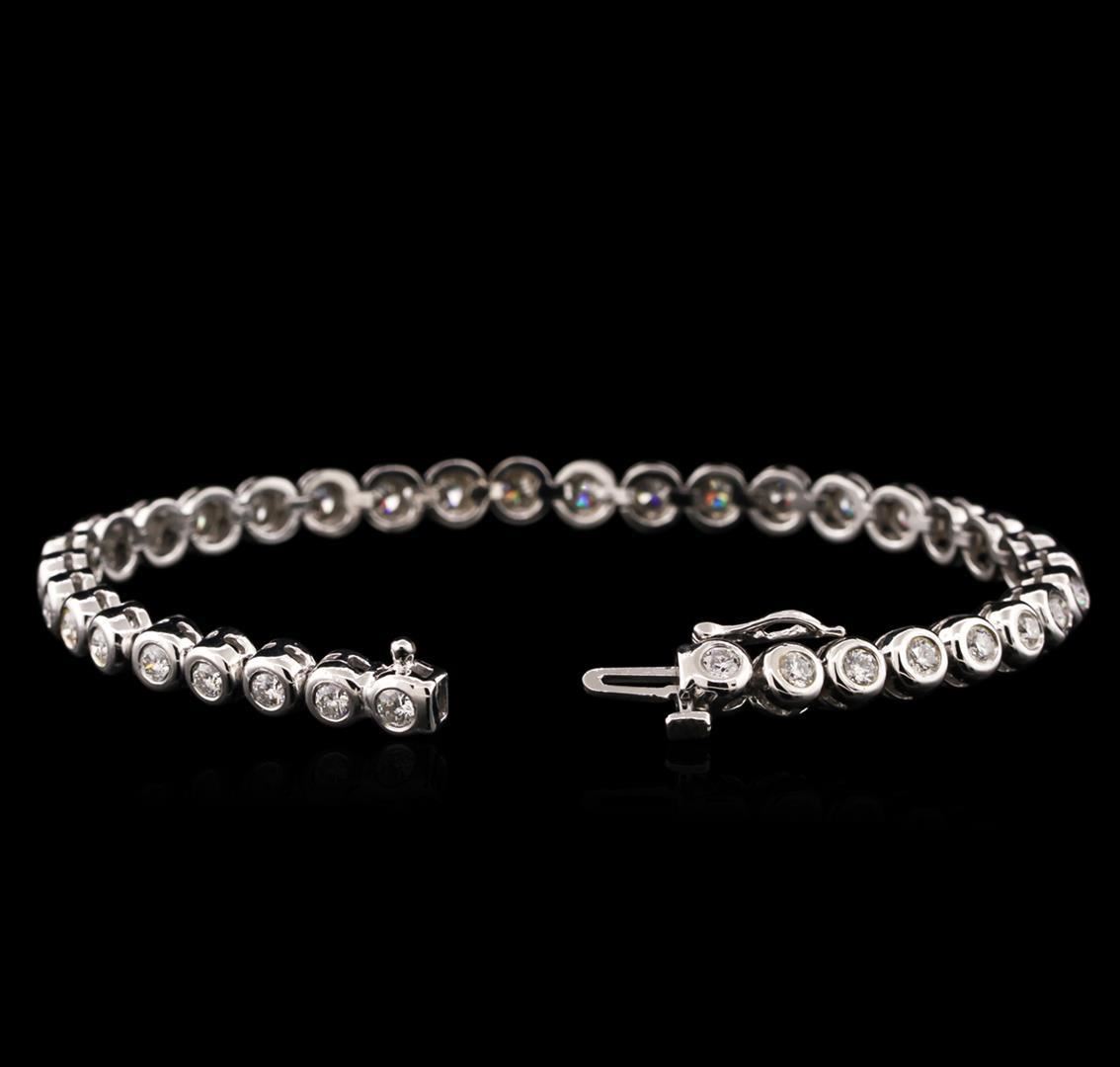 One electronically tested 14KT white gold ladies cast diamond tennis bracelet with a hidden box clasp with safety closer with a bright polish finish. Measurements: 7" in length Identified with markings of "14K". Condition is new. Containing: Thirty-Six bezel set round brilliant cut diamonds, measuring 2.70 - 2.70 x 1.62mm (depth est.) approximate total weight of 36 Stones = 2.45ct. Clarity: SI-2 to I-2. Color: H - I, Cut is Good. Diamonds are graded in the mounting, unless otherwise stated. Total Weight of Diamonds 2.45ct. Total Weight of Tennis Bracelet 17.30 grams. GGL Appraised.