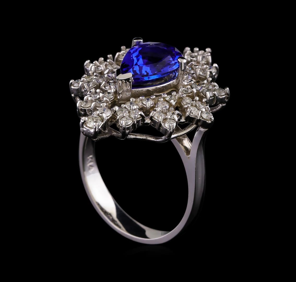 One electronically tested 14KT white gold ladies combination cast & assembled tanzanite and diamond ring with a bright polish finish. Identified with markings of "K14". Condition is new. Containing: One prong set pear modified brilliant cut natural tanzanite, measuring 10.00 x 7.50 x 4.88mm, approximate weight of 2.45ct., clarity is eye clean, type I, medium, moderately strong, violet color, (GIA V 5/4), cut is good. Fifty-Five prong set round brilliant cut diamonds, measuring 1.50 - 1.30 x 0.84mm (depth est.) approximate total weight of 55 Stones = 0.55ct. Clarity: SI-2 to I-1. Color: H - I, Cut is Good. Colored gemstones are presumed to have been subjected to commonly used enhancement processes. All diamonds and colored gemstones are graded in the mounting, unless otherwise stated. Total Weight of Colored Stones 2.45ct. Total Weight of Diamonds 0.55ct. Total Weight of Ring 7.10 grams. GGL Appraised.