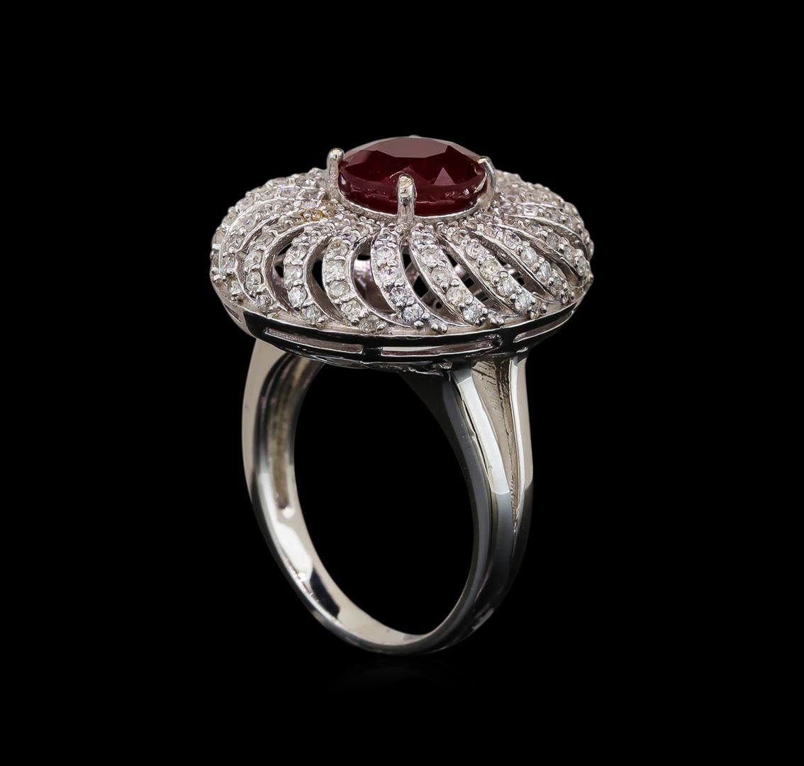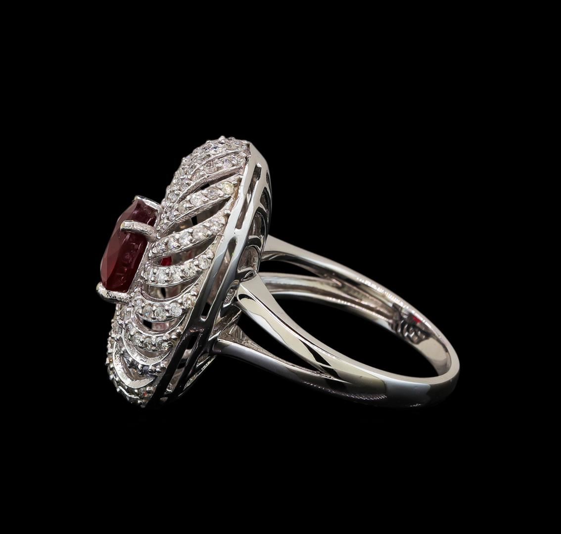 One electronically tested 14KT white gold ladies cast ruby and diamond ring with a bright polish finish. Identified with markings of "K14". Condition is new.Containing: One prong set round modified brilliant cut natural ruby, measuring 7.80 - 7.80 x 5.07 mm, approximate weight of 2.47ct., clarity is heavily included, type II, medium dark, moderately strong, strongly purplish red color, (GIA stpR 6/4), cut is good. One Hundred Forty-Eight prong set round brilliant cut diamonds, measuring 1.10 - 1.10 x 0.66mm (depth est.) approximate total weight of 148 Stones = 0.71ct. Clarity of SI-2 to I-1, Color of I - J, Cut is Good. All diamonds and colored gemstones are graded in the mounting, unless otherwise stated. Colored gemstones are presumed to have been subjected to commonly used enhancement processes. Total Weight of Colored Stones 2.47ct. Total Weight of Diamonds 0.71ct. Total Weight of Ring 8.20 grams. GGL Appraised.