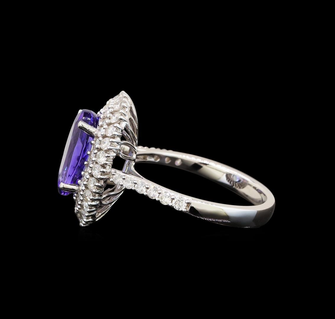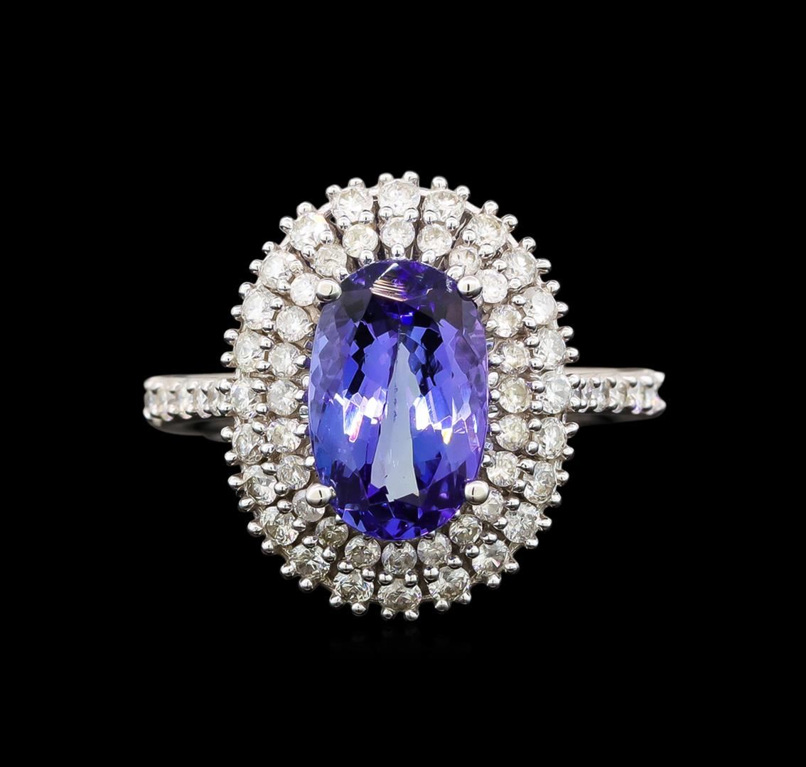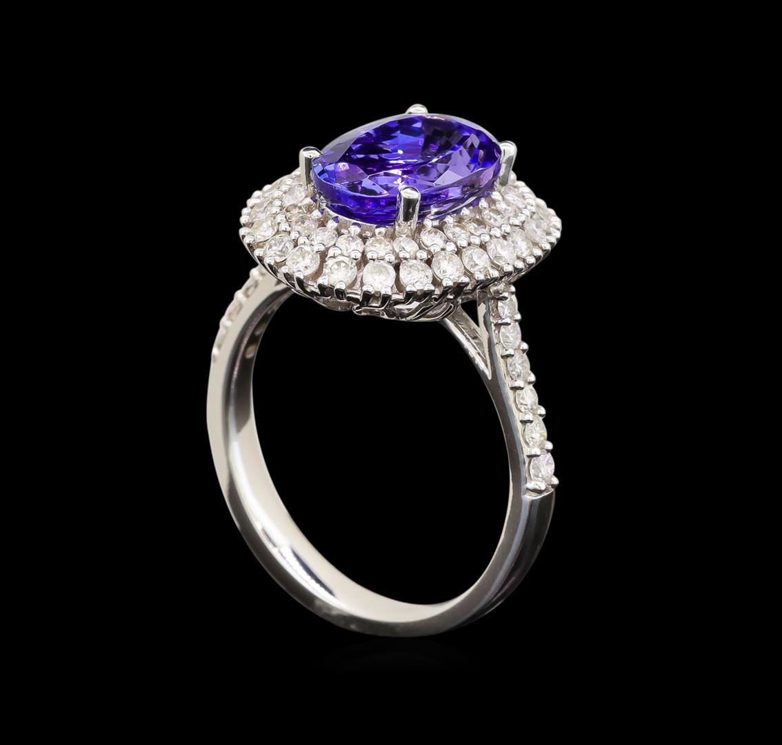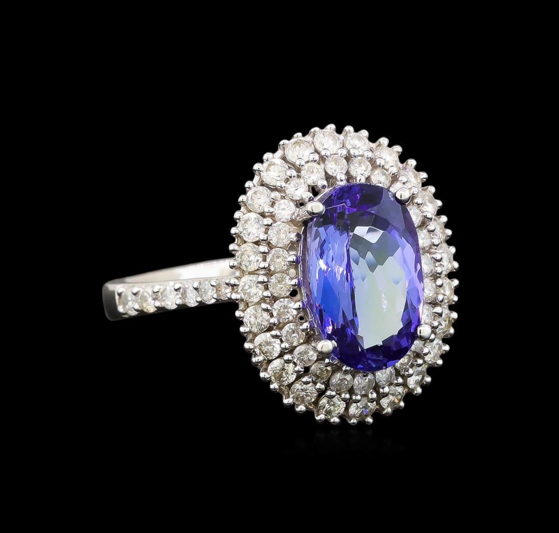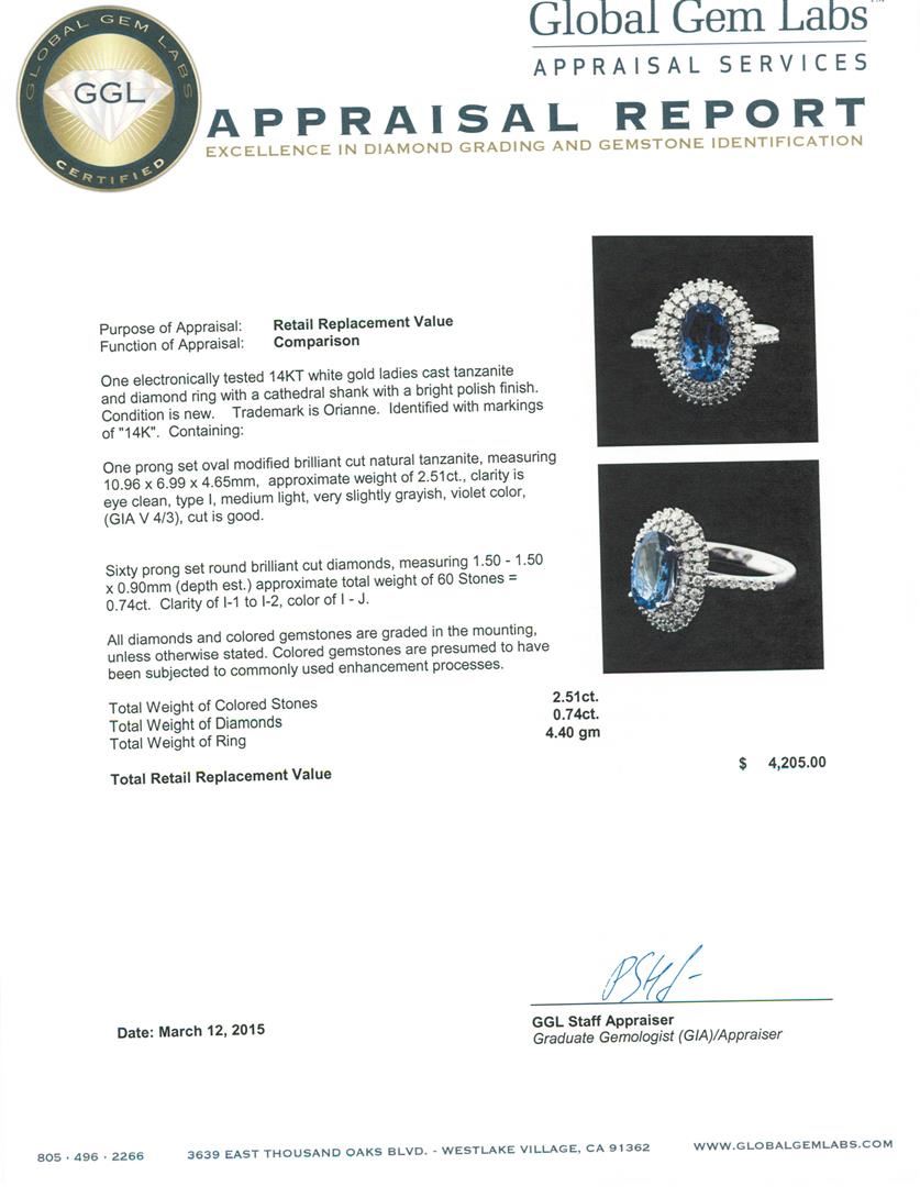 One electronically tested 14KT white gold ladies cast tanzanite and diamond ring with a cathedral shank with a bright polish finish. Trademark is Orianne. Identified with markings of "14K". Condition is new. Containing: One prong set oval modified brilliant cut natural tanzanite, measuring 10.96 x 6.99 x 4.65mm, approximate weight of 2.51ct., clarity is eye clean, type I, medium light, very slightly grayish, violet color, (GIA V 4/3), cut is good. Sixty prong set round brilliant cut diamonds, measuring 1.50 - 1.50 x 0.90mm (depth est.) approximate total weight of 60 Stones = 0.74ct. Clarity: I-1 to I-2. Color: I - J. All diamonds and colored gemstones are graded in the mounting, unless otherwise stated. Colored gemstones are presumed to have been subjected to commonly used enhancement processes.. Total Weight of Colored Stones 2.51ct. Total Weight of Diamonds 0.74ct. Total Weight of Ring 4.40 grams. GGL Appraised at $4,205.00.