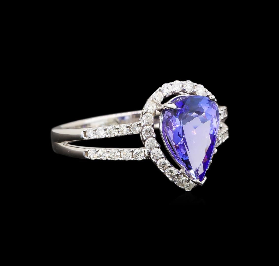 One electronically tested 14KT white gold ladies cast tanzanite and diamond ring with a split shoulder shank with a bright polish finish. Trademark is Orianne. Identified with markings of "14K". Condition is new. Containing: One prong set oval modified brilliant cut natural tanzanite, measuring 10.96 x 6.99 x 4.65mm, approximate weight of 2.51ct., clarity is eye clean, type I, medium light, very slightly grayish, violet color, (GIA V 4/3), cut is good. Forty-Two prong set round brilliant cut diamonds, measuring 1.20 - 1.20 x 0.72mm (depth est.) approximate total weight of 42 Stones = 0.27ct. Clarity: I-1 to I-2. Color: I - J. All diamonds and colored gemstones are graded in the mounting, unless otherwise stated. Colored gemstones are presumed to have been subjected to commonly used enhancement processes.. Total Weight of Colored Stones 2.51ct. Total Weight of Diamonds 0.27ct. Total Weight of Ring 3.00 grams. GGL Appraised.
