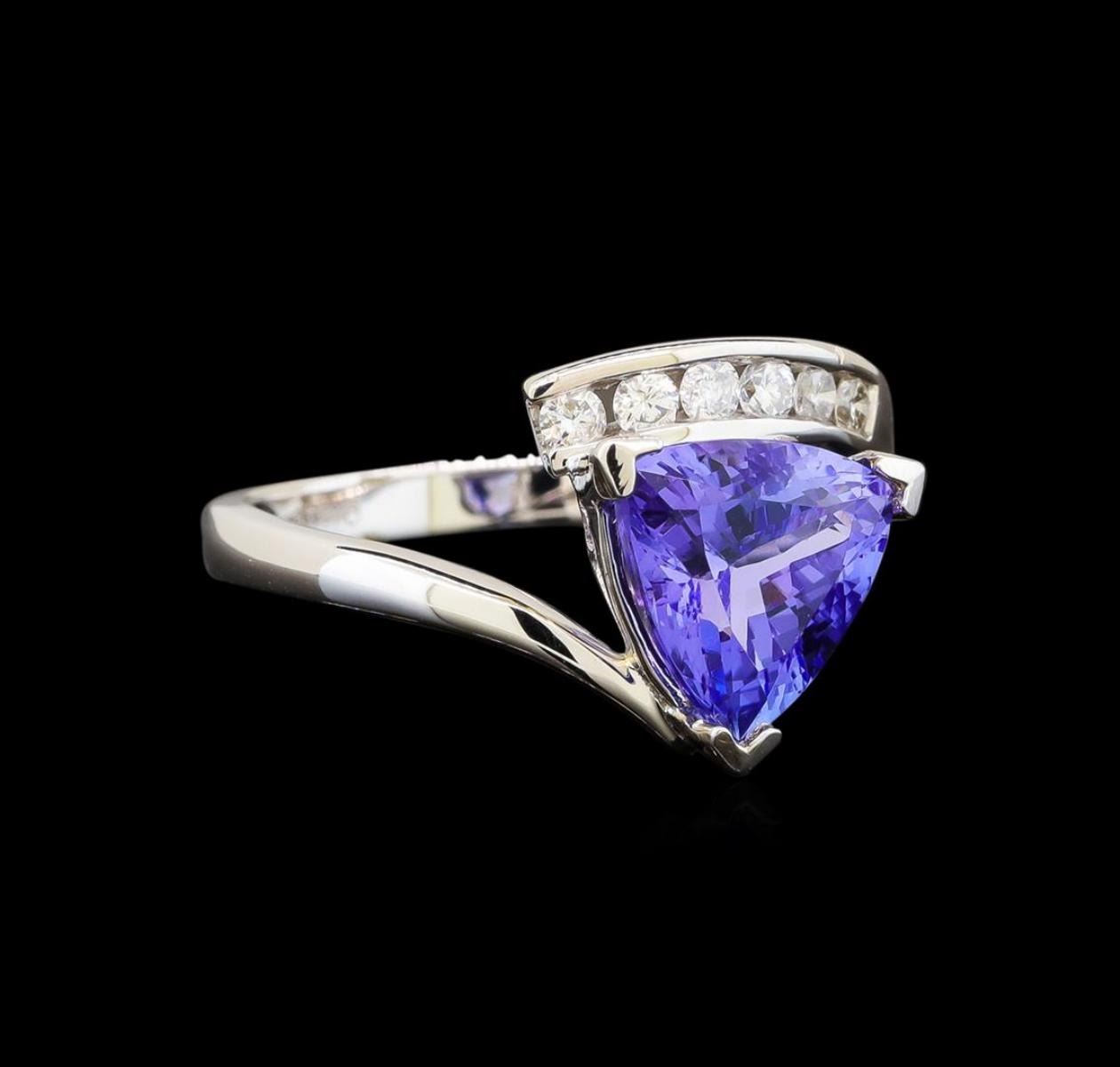 One electronically tested 14KT white gold ladies cast tanzanite and diamond ring with a flat shank with a bright polish finish. Trademark is Orianne. Identified with markings of "14K". Condition is new. Containing: One prong set triangle modified brilliant cut natural tanzanite, measuring 8.61 x 8.43 x 5.73mm, approximate weight of 2.51ct., clarity is eye clean, type I, medium, very slightly grayish, violet color, (GIA V 5/3), cut is good. Six channel set round brilliant cut diamonds, measuring 1.50 - 1.50 x 0.90mm (depth est.) approximate total weight of 6 Stones = 0.07ct. Clarity: SI-2 to I-1. Color: I - J, Cut is Good. All diamonds and colored gemstones are graded in the mounting, unless otherwise stated. Colored gemstones are presumed to have been subjected to commonly used enhancement processes.. Total Weight of Colored Stones 2.51ct. Total Weight of Diamonds 0.07ct. Total Weight of Ring 3.90 grams. GGL Appraised.