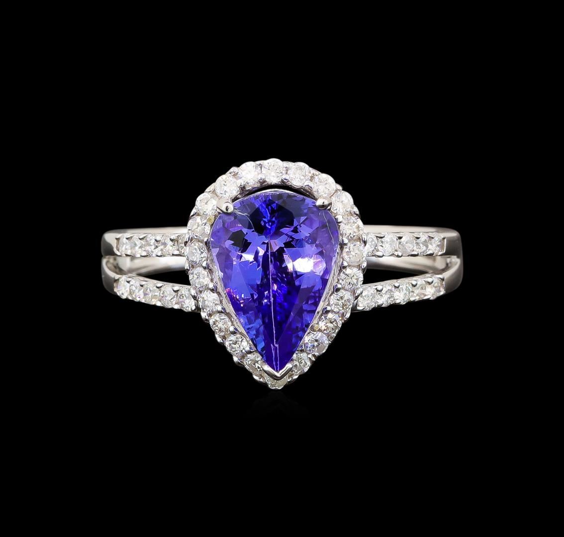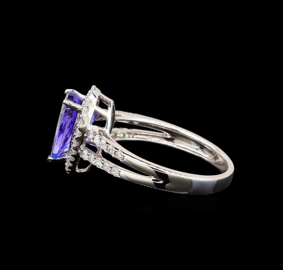 One electronically tested 14KT white gold ladies cast tanzanite and diamond ring with a split shoulder shank with a bright polish finish. Trademark is Orianne. Identified with markings of "14K". Condition is new. Containing: One prong set oval modified brilliant cut natural tanzanite, measuring 10.96 x 6.99 x 4.65mm, approximate weight of 2.51ct., clarity is eye clean, type I, medium light, very slightly grayish, violet color, (GIA V 4/3), cut is good. Forty-Two prong set round brilliant cut diamonds, measuring 1.20 - 1.20 x 0.72mm (depth est.) approximate total weight of 42 Stones = 0.27ct. Clarity: I-1 to I-2. Color: I - J. All diamonds and colored gemstones are graded in the mounting, unless otherwise stated. Colored gemstones are presumed to have been subjected to commonly used enhancement processes.. Total Weight of Colored Stones 2.51ct. Total Weight of Diamonds 0.27ct. Total Weight of Ring 3.00 grams. GGL Appraised.
