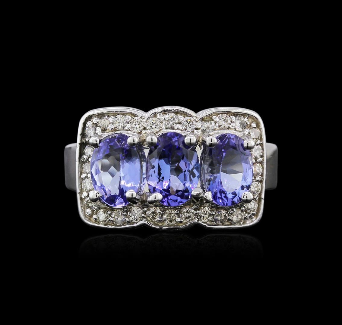 One electronically tested 14KT white gold ladies cast tanzanite and diamond three stone ring with a tapered shank with a bright polish finish. Identified with markings of "K14". Condition is new. Containing: Three prong set oval modified brilliant cut natural tanzanites, measuring 7.05 x 5.20 x 3.24mm, approximate total weight of 2.52ct., clarity is eye clean, type I, medium light, very slightly grayish, violet color, (GIA V 4/3), cut is good. Twenty-Eight prong set round brilliant cut diamonds, measuring 1.50 - 1.50 x 0.90mm (depth est.) approximate total weight of 28 Stones = 0.34ct. Clarity: SI-2 to I-1. Color: H - I, Cut is Good. Colored gemstones are presumed to have been subjected to commonly used enhancement processes. Diamonds and colored gemstones are graded in the mounting, unless otherwise stated. Total Weight of Colored Stones 2.52ct. Total Weight of Diamonds 0.34ct. Total Weight of Three Stone Ring 7.50 grams. GGL Appraised.