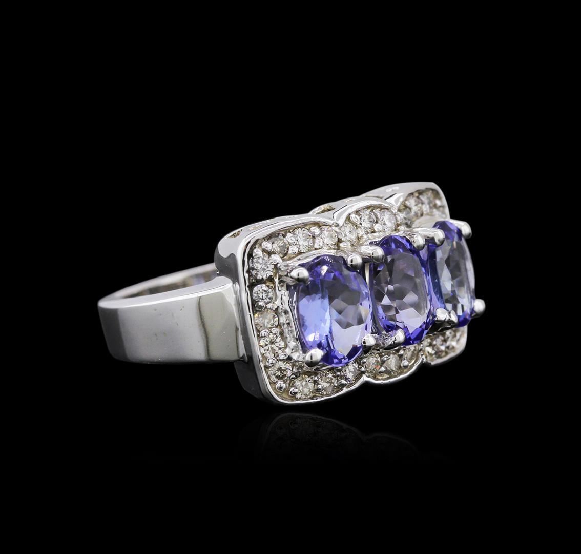 One electronically tested 14KT white gold ladies cast tanzanite and diamond three stone ring with a tapered shank with a bright polish finish. Identified with markings of "K14". Condition is new. Containing: Three prong set oval modified brilliant cut natural tanzanites, measuring 7.05 x 5.20 x 3.24mm, approximate total weight of 2.52ct., clarity is eye clean, type I, medium light, very slightly grayish, violet color, (GIA V 4/3), cut is good. Twenty-Eight prong set round brilliant cut diamonds, measuring 1.50 - 1.50 x 0.90mm (depth est.) approximate total weight of 28 Stones = 0.34ct. Clarity: SI-2 to I-1. Color: H - I, Cut is Good. Colored gemstones are presumed to have been subjected to commonly used enhancement processes. Diamonds and colored gemstones are graded in the mounting, unless otherwise stated. Total Weight of Colored Stones 2.52ct. Total Weight of Diamonds 0.34ct. Total Weight of Three Stone Ring 7.50 grams. GGL Appraised.