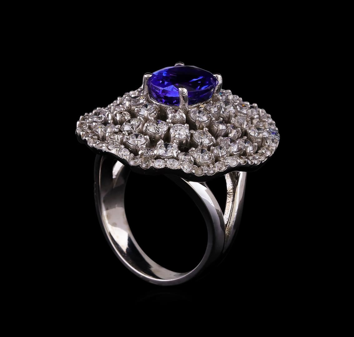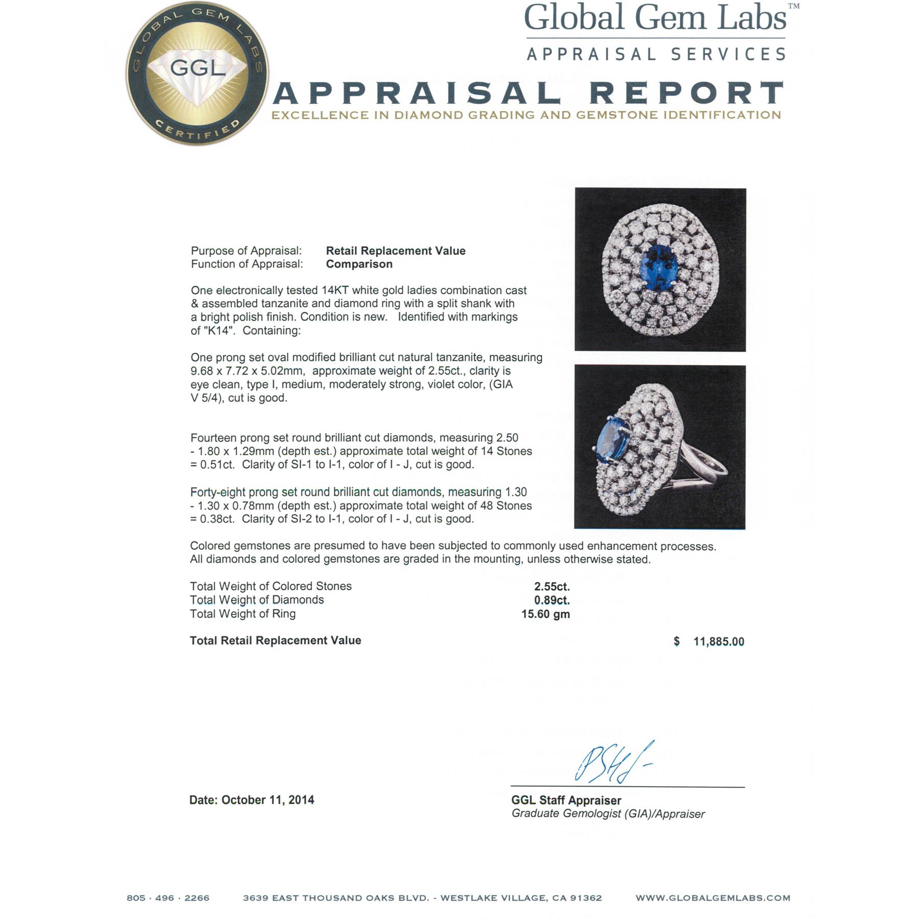 One electronically tested 14KT white gold ladies combination cast & assembled tanzanite and diamond ring with a split shank with a bright polish finish. Identified with markings of "K14". Condition is new. Containing: One prong set oval modified brilliant cut natural tanzanite, measuring 9.68 x 7.72 x 5.02mm, approximate weight of 2.55ct., clarity is eye clean, type I, medium, moderately strong, violet color, (GIA V 5/4), cut is good. Fourteen prong set round brilliant cut diamonds, measuring 2.50 - 1.80 x 1.29mm (depth est.) approximate total weight of 14 Stones = 0.51ct. Clarity: SI-1 to I-1. Color: I - J, Cut is Good. Forty-Eight prong set round brilliant cut diamonds, measuring 1.30 - 1.30 x 0.78mm (depth est.) approximate total weight of 48 Stones = 0.38ct. Clarity: SI-2 to I-1. Color: I - J, Cut is Good. Colored gemstones are presumed to have been subjected to commonly used enhancement processes. All diamonds and colored gemstones are graded in the mounting, unless otherwise stated. Total Weight of Colored Stones 2.55ct. Total Weight of Diamonds 0.89ct. Total Weight of Ring 15.60 grams. GGL Appraised.