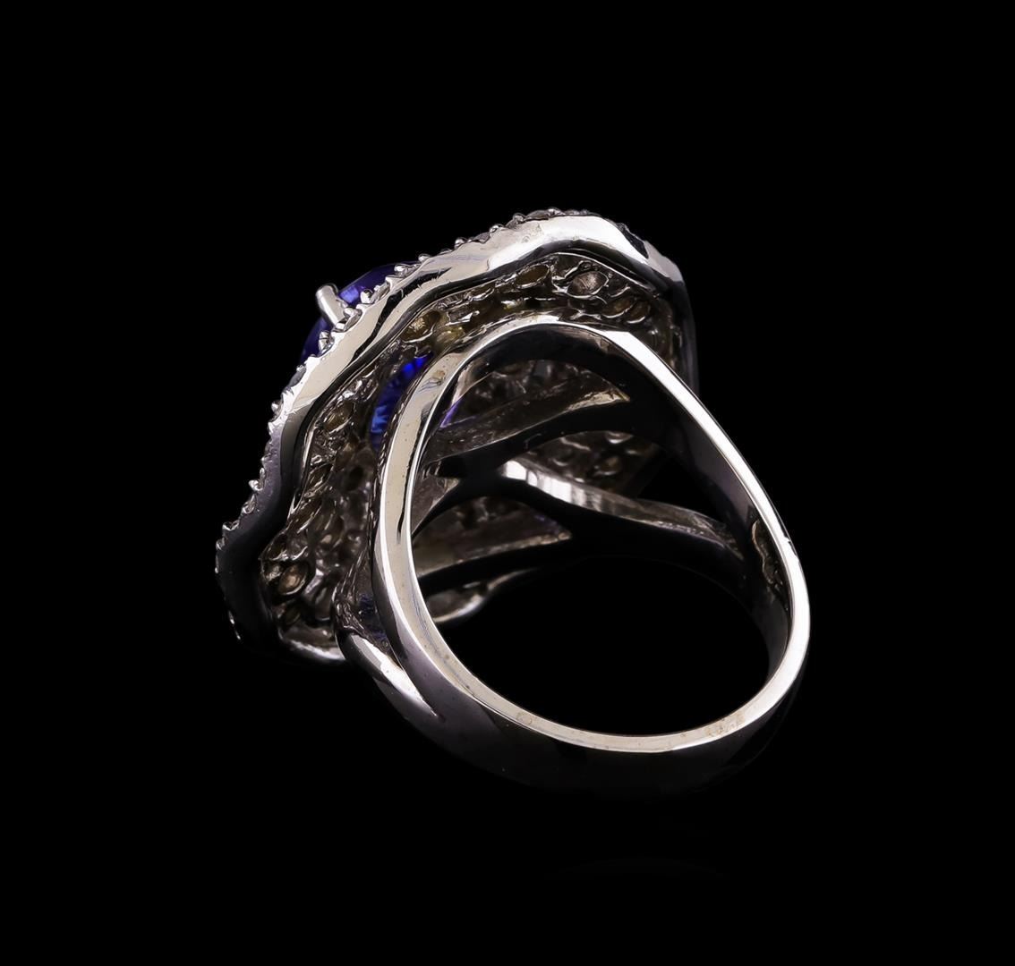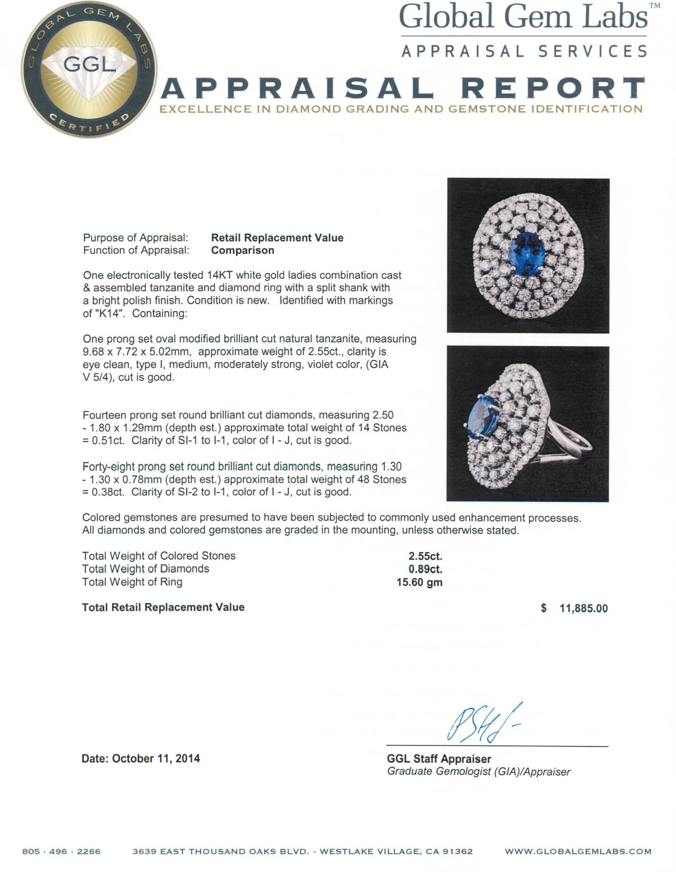 One electronically tested 14KT white gold ladies combination cast & assembled tanzanite and diamond ring with a split shank with a bright polish finish. Identified with markings of "K14". Condition is new. Containing: One prong set oval modified brilliant cut natural tanzanite, measuring 9.68 x 7.72 x 5.02mm, approximate weight of 2.55ct., clarity is eye clean, type I, medium, moderately strong, violet color, (GIA V 5/4), cut is good. Fourteen prong set round brilliant cut diamonds, measuring 2.50 - 1.80 x 1.29mm (depth est.) approximate total weight of 14 Stones = 0.51ct. Clarity: SI-1 to I-1. Color: I - J, Cut is Good. Forty-Eight prong set round brilliant cut diamonds, measuring 1.30 - 1.30 x 0.78mm (depth est.) approximate total weight of 48 Stones = 0.38ct. Clarity: SI-2 to I-1. Color: I - J, Cut is Good. Colored gemstones are presumed to have been subjected to commonly used enhancement processes. All diamonds and colored gemstones are graded in the mounting, unless otherwise stated. Total Weight of Colored Stones 2.55ct. Total Weight of Diamonds 0.89ct. Total Weight of Ring 15.60 grams. GGL Appraised.