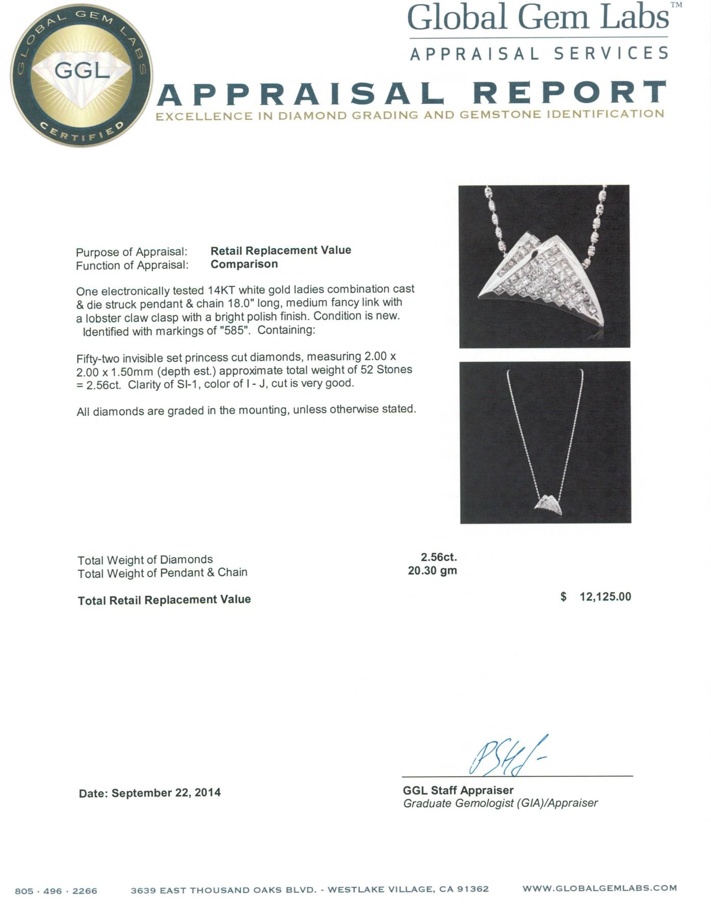 One electronically tested 14KT white gold ladies combination cast & die struck pendant & chain 18.0" long, medium fancy link with a lobster claw clasp with a bright polish finish. Identified with markings of "585". Condition is new. Containing: Fifty-Two invisible set princess cut diamonds, measuring 2.00 x 2.00 x 1.50mm (depth est.) approximate total weight of 52 Stones = 2.56ct. Clarity: SI-1. Color: I - J, Cut is Very Good. All diamonds are graded in the mounting, unless otherwise stated. Total Weight of Diamonds 2.56ct. Total Weight of Pendant & Chain 20.30 grams. GGL Appraised.