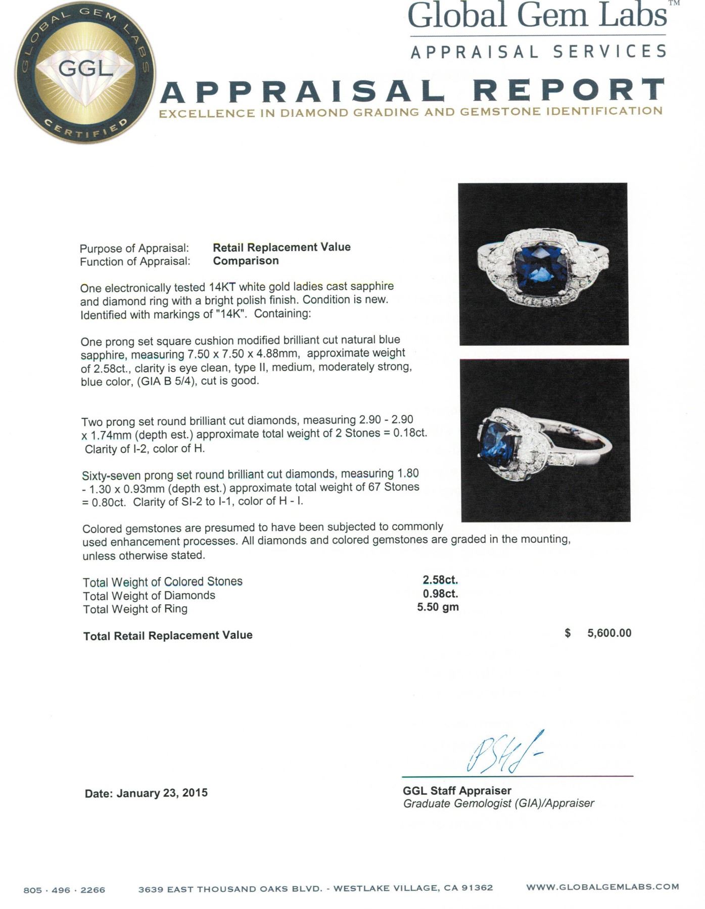 One electronically tested 14KT white gold ladies cast sapphire and diamond ring with a bright polish finish. Identified with markings of "14K". Condition is new. Containing: One prong set square cushion modified brilliant cut natural blue sapphire, measuring 7.50 x 7.50 x 4.88mm, approximate weight of 2.58ct., clarity is eye clean, type II, medium, moderately strong, blue color, (GIA B 5/4), cut is good. Two prong set round brilliant cut diamonds, measuring 2.90 - 2.90 x 1.74mm (depth est.) approximate total weight of 2 Stones = 0.18ct. Clarity: I-2. Color: H. Sixty-Seven prong set round brilliant cut diamonds, measuring 1.80 - 1.30 x 0.93mm (depth est.) approximate total weight of 67 Stones = 0.80 ct. Clarity: SI-2 to I-1. Color: H - I. Colored gemstones are presumed to have been subjected to commonly used enhancement processes. All diamonds and colored gemstones are graded in the mounting, unless otherwise stated. Total Weight of Colored Stones 2.58ct. Total Weight of Diamonds 0.98ct. Total Weight of Ring 5.50 grams. GGL Appraised.