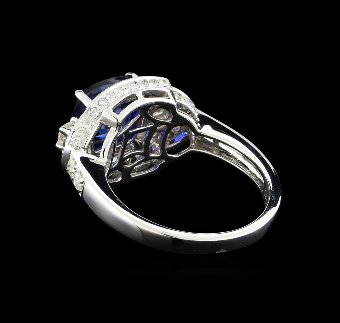 One electronically tested 14KT white gold ladies cast sapphire and diamond ring with a bright polish finish. Identified with markings of "14K". Condition is new. Containing: One prong set square cushion modified brilliant cut natural blue sapphire, measuring 7.50 x 7.50 x 4.88mm, approximate weight of 2.58ct., clarity is eye clean, type II, medium, moderately strong, blue color, (GIA B 5/4), cut is good. Two prong set round brilliant cut diamonds, measuring 2.90 - 2.90 x 1.74mm (depth est.) approximate total weight of 2 Stones = 0.18ct. Clarity: I-2. Color: H. Sixty-Seven prong set round brilliant cut diamonds, measuring 1.80 - 1.30 x 0.93mm (depth est.) approximate total weight of 67 Stones = 0.80 ct. Clarity: SI-2 to I-1. Color: H - I. Colored gemstones are presumed to have been subjected to commonly used enhancement processes. All diamonds and colored gemstones are graded in the mounting, unless otherwise stated. Total Weight of Colored Stones 2.58ct. Total Weight of Diamonds 0.98ct. Total Weight of Ring 5.50 grams. GGL Appraised.