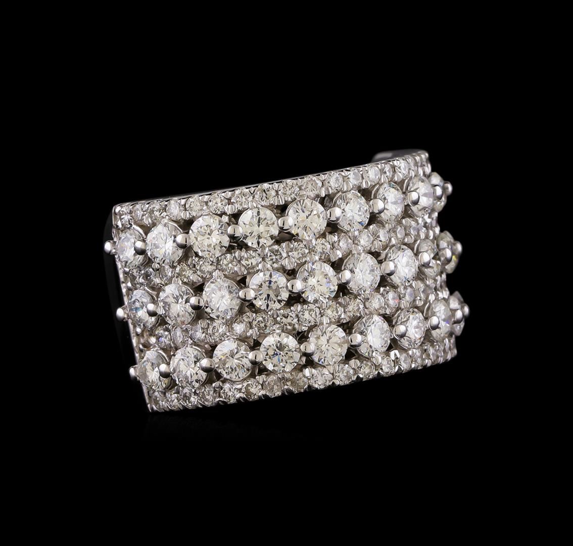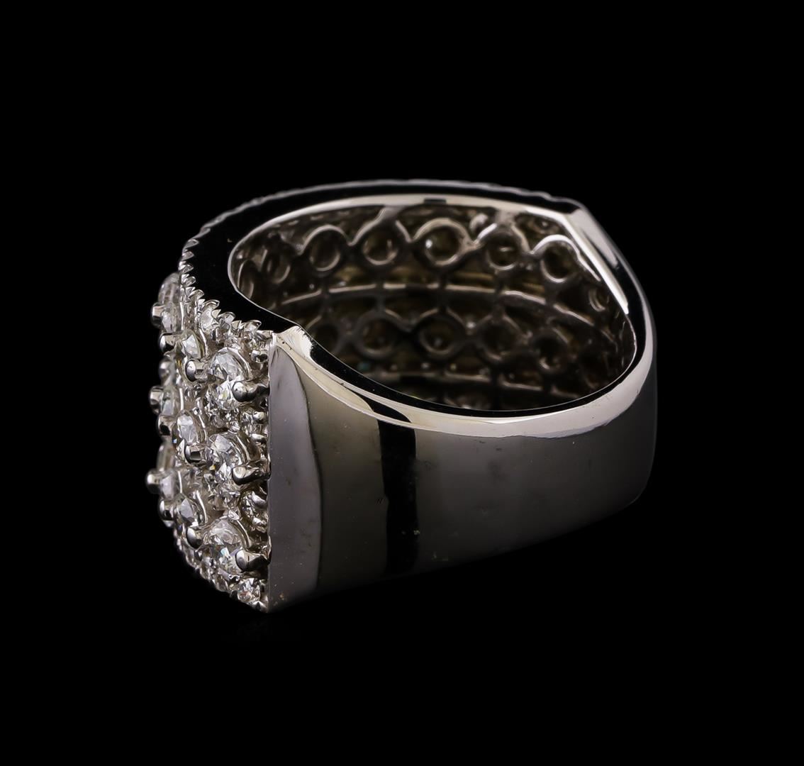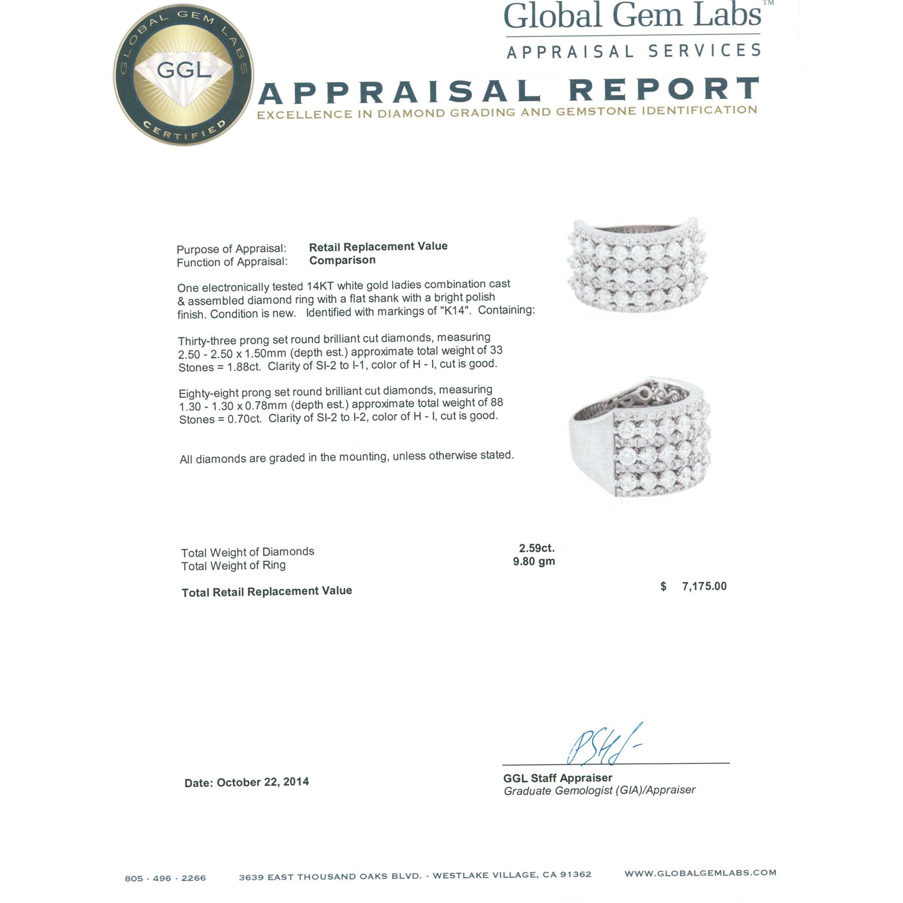 One electronically tested 14KT white gold ladies combination cast & assembled diamond ring with a flat shank with a bright polish finish. Identified with markings of "K14". Condition is new. Containing: Thirty-Three prong set round brilliant cut diamonds, measuring 2.50 - 2.50 x 1.50mm (depth est.) approximate total weight of 33 Stones = 1.88ct. Clarity: SI-2 to I-1. Color: H - I, Cut is Good. Eighty-Eight prong set round brilliant cut diamonds, measuring 1.30 - 1.30 x 0.78mm (depth est.) approximate total weight of 88 Stones = 0.70ct. Clarity: SI-2 to I-2. Color: H - I, Cut is Good. All diamonds are graded in the mounting, unless otherwise stated. Total Weight of Diamonds 2.59ct. Total Weight of Ring 9.80 grams. GGL Appraised.