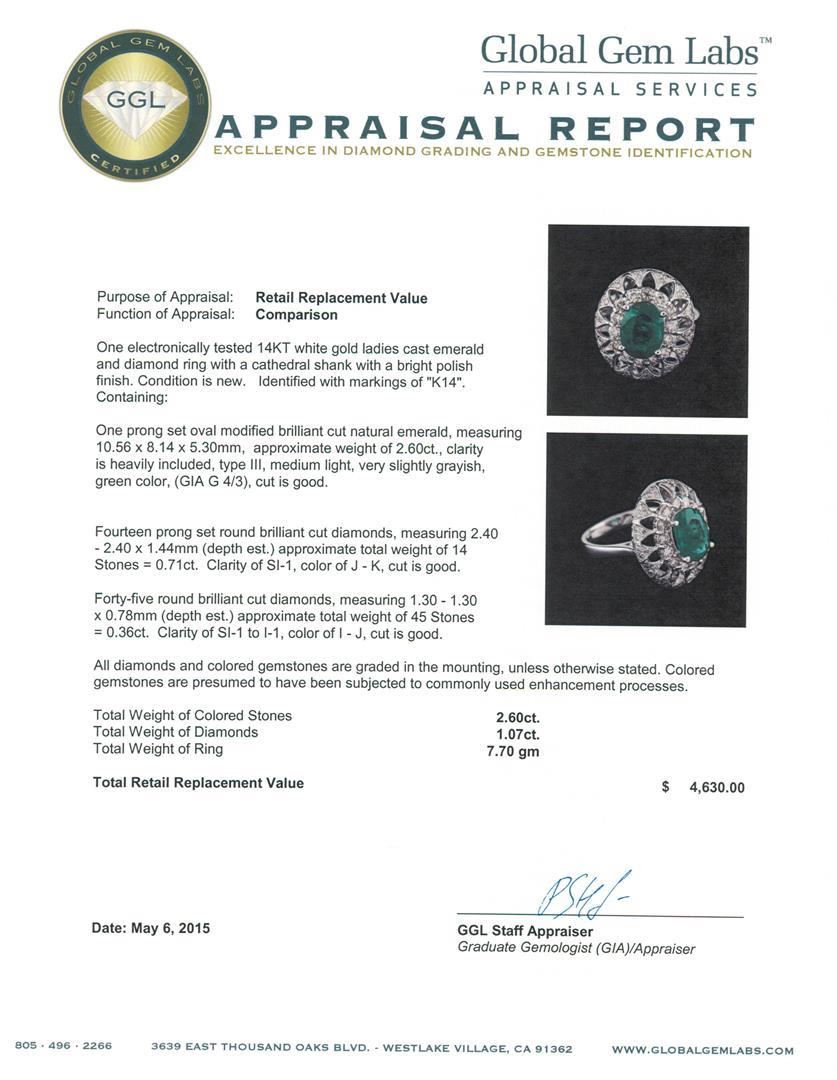 One electronically tested 14KT white gold ladies cast emerald and diamond ring with a cathedral shank with a bright polish finish. Identified with markings of "K14". Condition is new. Containing: One prong set oval modified brilliant cut natural emerald, measuring 10.56 x 8.14 x 5.30mm, approximate weight of 2.60ct., clarity is heavily included, type III, medium light, very slightly grayish, green color, (GIA G 4/3), cut is good. Fourteen prong set round brilliant cut diamonds, measuring 2.40 - 2.40 x 1.44mm (depth est.) approximate total weight of 14 Stones = 0.71ct. Clarity: SI-1. Color: J - K, Cut is Good. Forty-Five round brilliant cut diamonds, measuring 1.30 - 1.30 x 0.78mm (depth est.) approximate total weight of 45 Stones = 0.36ct. Clarity: SI-1 to I-1. Color: I - J, Cut is Good. All diamonds and colored gemstones are graded in the mounting, unless otherwise stated. Colored gemstones are presumed to have been subjected to commonly used enhancement processes.. Total Weight of Colored Stones 2.60ct. Total Weight of Diamonds 1.07ct. Total Weight of Ring 7.70 grams. GGL Appraised.